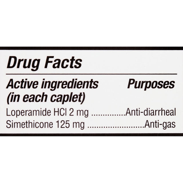 - ACTIVE INGREDIENTS: This product contains loperamide hydrochloride 2 mg, anti-diarrheal, and simethicone 125 mg, anti-gas, which compares to the active ingredients of Imodium® Multi-Symptom Relief.