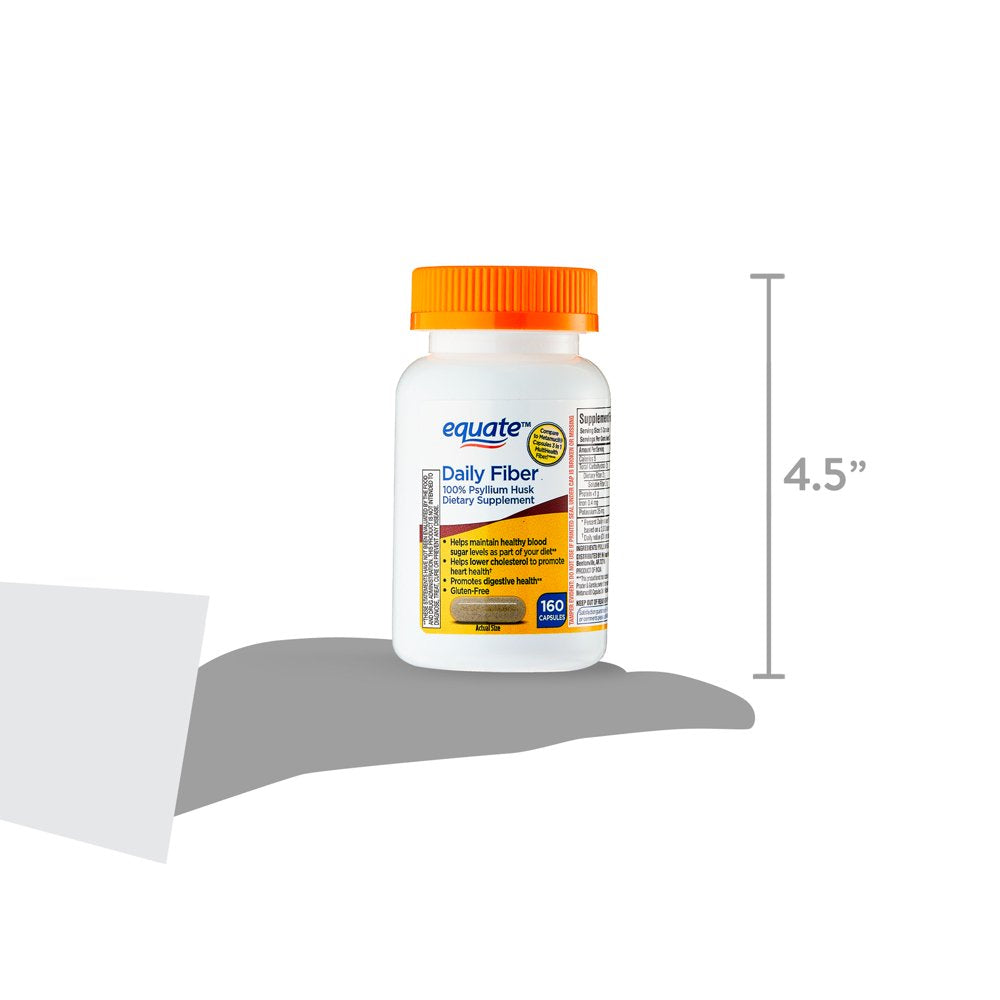 Equate Daily Fiber Supplement Capsules are perfect for relieving a backed-up digestive system. Each dietary supplement capsule is made with 100% psyllium husk fiber, which promotes digestive health and works to keep digestion on a regular schedule. Take a fiber supplement daily with a glass of water to help maintain healthy blood sugar levels**, lower cholesterol to support heart health†, and promote digestive health**. Each gluten-free capsule works daily to keep your digestive system moving along through reliable and healthy daily fiber intake. Sell Package Quantity contains 160 psyllium husk fiber dietary supplement capsules.