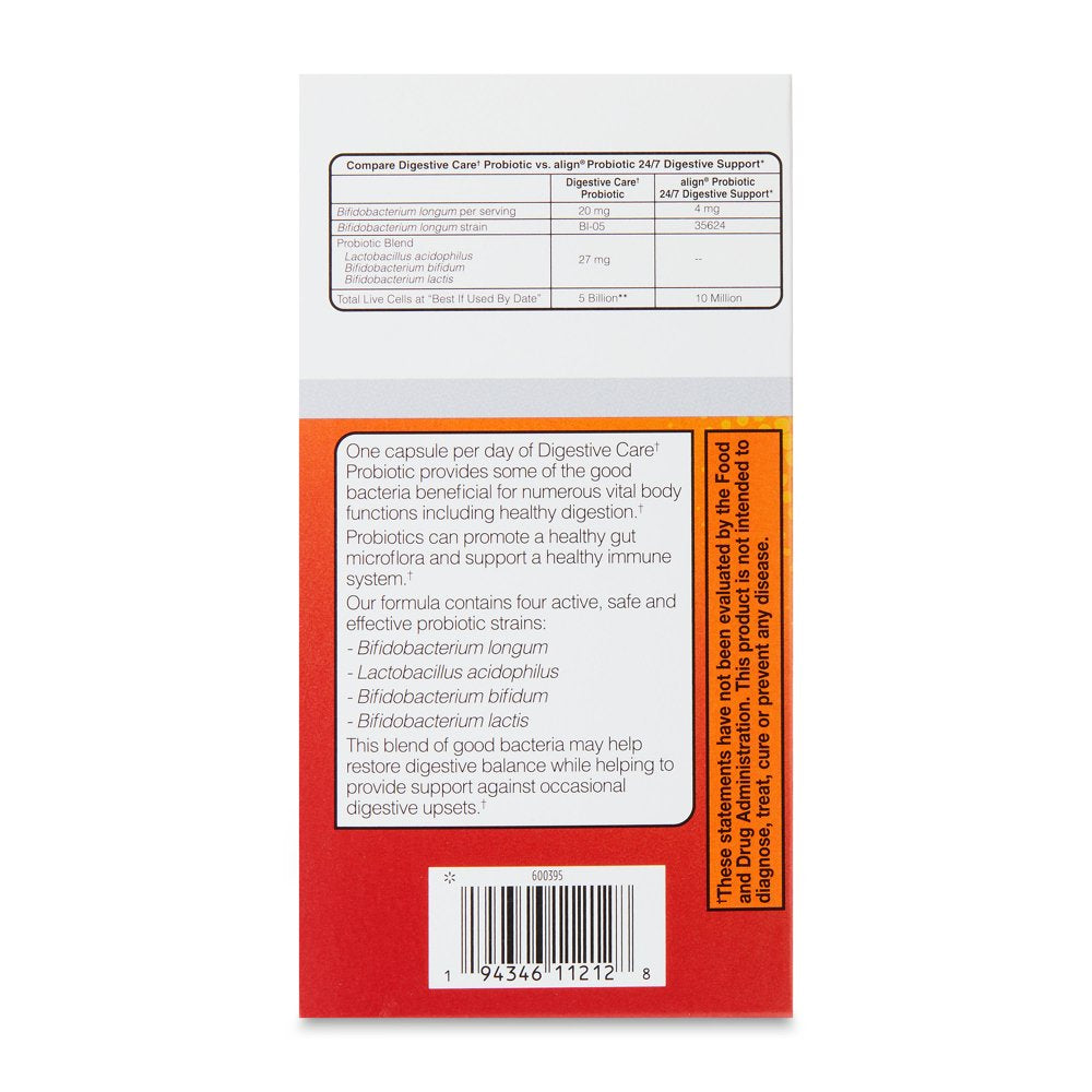 Equate Digestive Care Probiotic Capsules are a continued daily use dietary supplement formulated to promote digestive and immune health and support colon balance so you can feel good every day. When bacteria get out of balance, digestive issues like gas, bloating and constipation can occur. Stress, travel, aging, and bad diets can disrupt your body's digestive system. Probiotics are the good bacteria in your gut that play a critical role in supporting digestive health. Healthy bacteria and active cultures reflect your gut's natural diversity and keep it thriving. Probiotics promote regularity, nutrient absorption and provide support against occasional digestive discomfort. So live happily. Live healthily. Keep your digestive system in sync and maximize the benefits of a healthy diet so you can continue doing the things you love to do with Equate Digestive Care Probiotic Capsules.