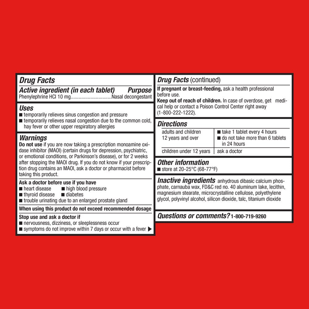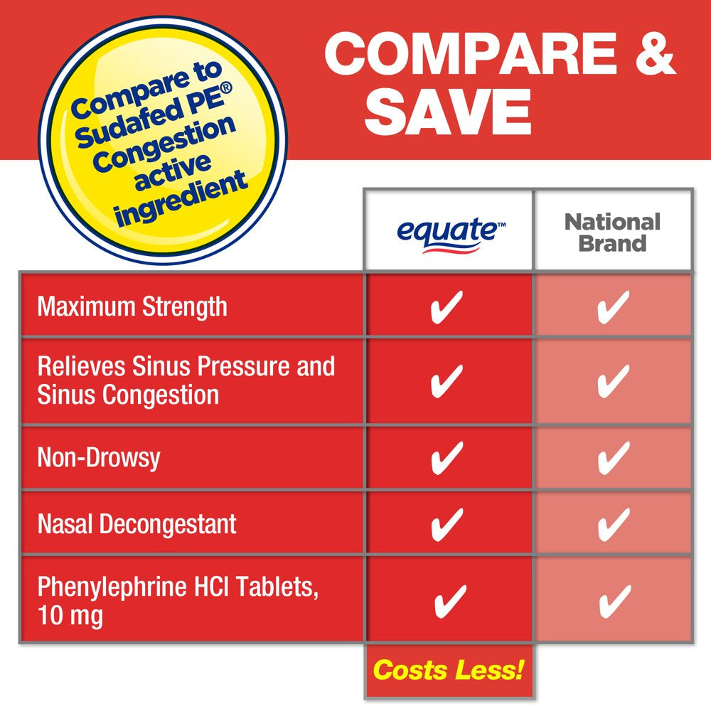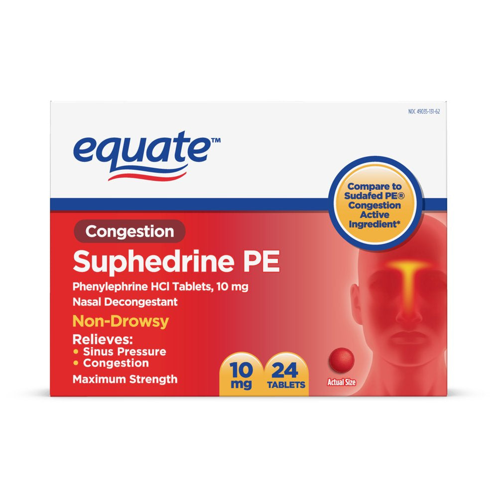 Compare to Sudafed PE Congestion active ingredient. Treat common cold symptoms with Equate Maximum Strength Nasal Decongestant PE, Phenylephrine HCl, 10 mg. This cold medicine provides maximum strength, non-drowsy relief for nasal and sinus congestion and sinus pressure due to the common cold, hay fever or other upper respiratory allergies. These tablets do not contain Pseudoephedrine, and the medicine is free of aspirin and gluten. Get symptom relief without the sleepiness with this non-drowsy formula. Take one tablet per dose for fast, maximum strength relief from your sinus pressure and congestion. Safe for adults and children 12 years of age and over.