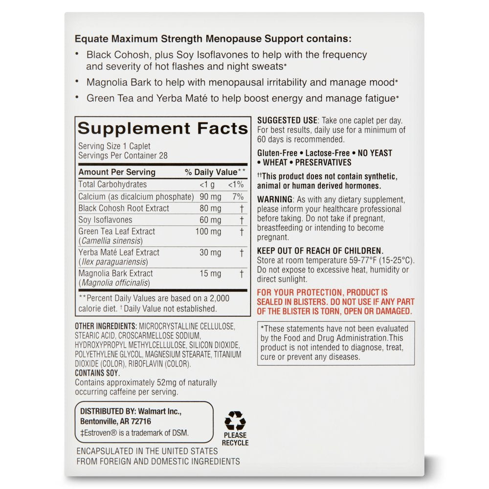 Equate Maximum Strength Menopause Support Dietary Supplement is a daily supplement that provides maximum strength support for those suffering from bothersome menopause symptoms. It contains black cohosh and soy isoflavones to help with the frequency and severity of hot flashes and night sweats. The magnolia bark helps with menopausal irritability and mood management, while green tea and yerba mate help to boost energy and manage fatigue. This drug- and estrogen-free dietary supplement does not contain gluten, lactose, yeast, wheat, preservatives, or synthetic, animal, or human derived hormones. For an affordable and effective drug-free solution for uncomfortable symptoms of menopause, regain control with Equate Maximum Strength Menopause Support Dietary Supplement.