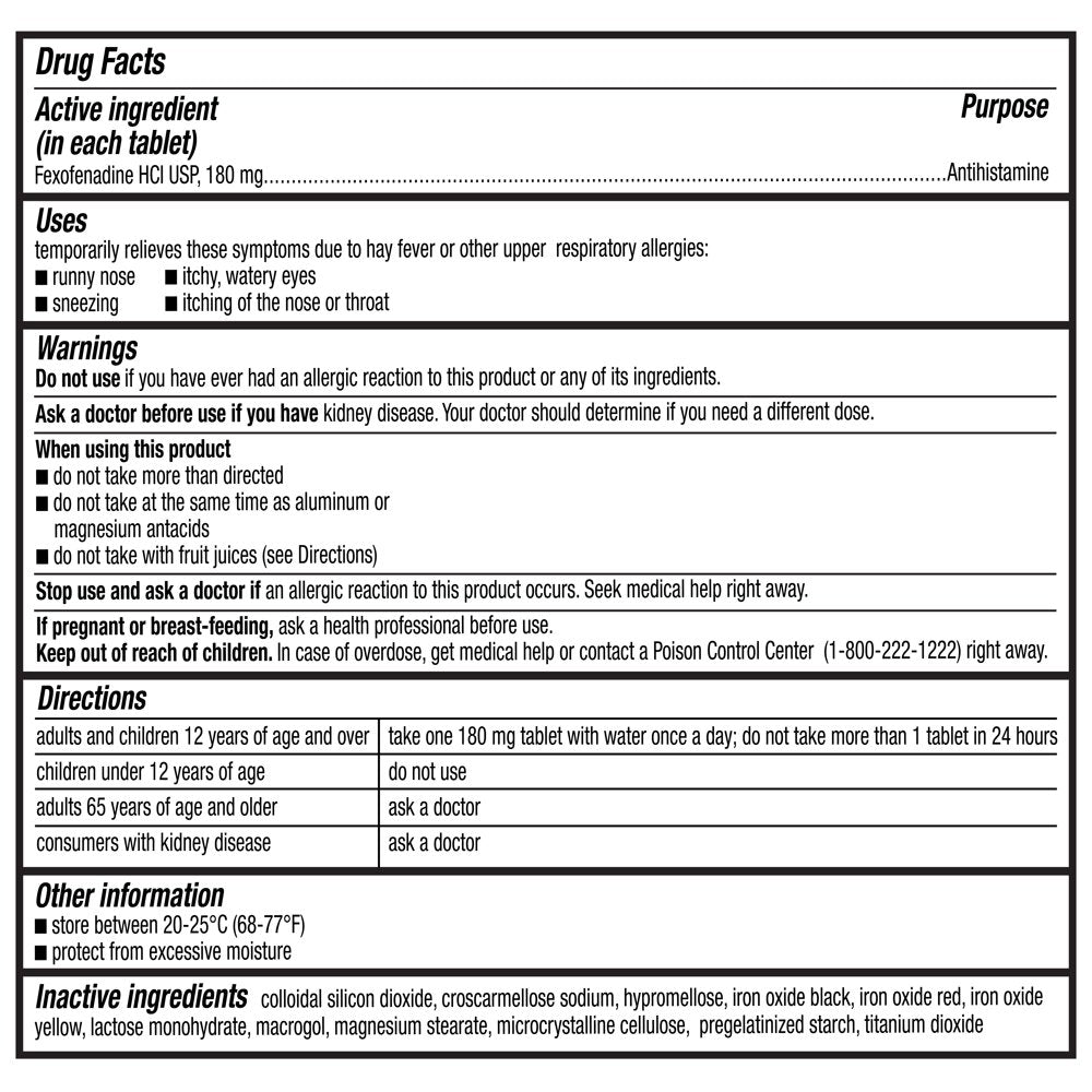 - Active ingredient: Fexofenadine HCL USP 180mg – antihistamine