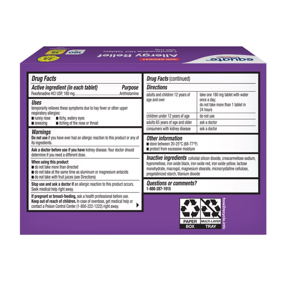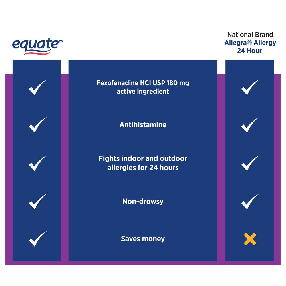 Help relieve your allergy symptoms with Equate Non-Drowsy Allergy Relief Fexofenadine HCL USP 180mg Caplets. Comparative to Allegra active ingredient, these non-drowsy tablets contain 180 mg of the antihistamine fexofenadine HCl for 24-hour relief from indoor and outdoor allergies. These caplets temporarily relieve symptoms due to hay fever or other upper respiratory allergies: runny nose, sneezing, itchy, watery eyes, itching of the nose or throat. Don't let allergies interfere with your busy life. When you want the ease and convenience of effective, 24-hour symptom relief, reach for Equate Non-Drowsy Allergy Relief Fexofenadine 180mg Caplets.