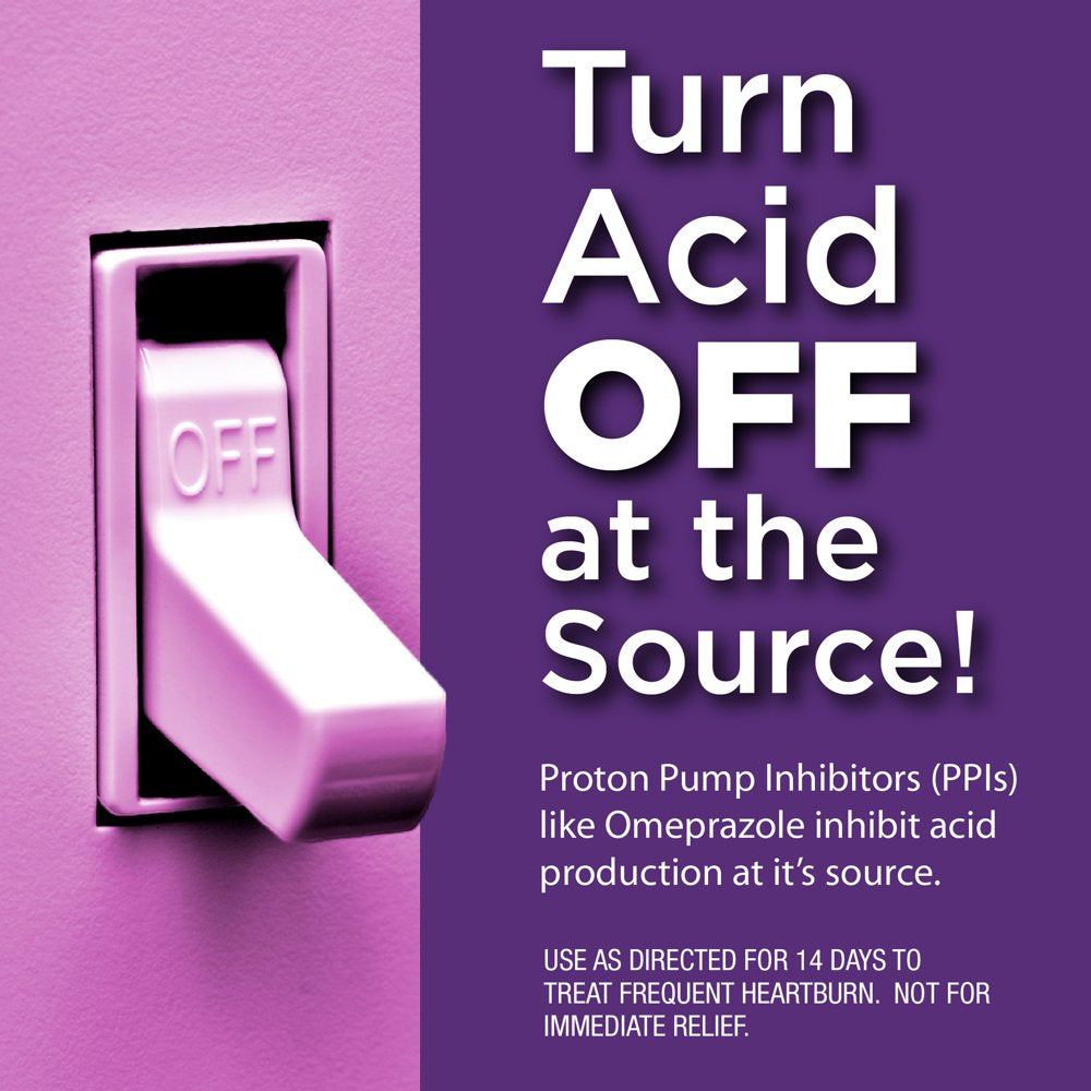 Compare to Prilosec OTC. Stop the painful burning sensation of frequent heartburn before it begins with Equate Omeprazole Delayed Release Tablets 20 mg. Omeprazole is the #1 Active Ingredient for Frequent Heartburn (based on iRi sales volume among PPI products sold in the United States, for the 52 weeks ending 01/01/23). When used as directed for 14 days, Omeprazole prevents heartburn that is frequent in nature and provides long-lasting, 24-hour relief so you can enjoy every moment with family and friends. This heartburn medicine may take one to four days for full effect, although some people get complete relief of symptoms within 24 hours. Proton Pump Inhibitors (PPIs), like Omeprazole, work differently from antacid tablets and other acid reducer pills. These heartburn relief treatments only neutralize the stomach acid and provide shorter relief (less than 24 hours). Omeprazole stops acid production at the source, preventing the acid that causes heartburn symptoms for relief that lasts all day and night. This heartburn medicine is a 14-day course of treatment that should be taken once every 24 hours for 14 days to treat frequent heartburn flare-ups. For adults 18 years and older suffering from frequent heartburn that occurs two or more days a week.