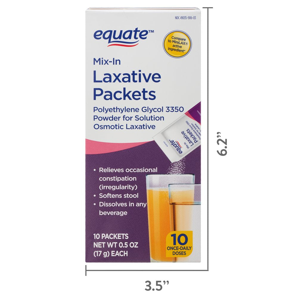 Relieve your occasional constipation or irregularity with our Equate Mix-In Laxative Packets. These convenient single-dose, once-daily packets are a great on-the-go alternative for busy lifestyles. Our Equate Mix-In Laxative Packets work with the water in your body to increase the number of bowel movements. Every Equate Mix-In Laxative Packet contains polyethylene glycol 3350 powder that dissolves completely in water or any beverage of your choice, whether cold, hot or room temperature, with no added grit or taste. Get back to normal with our Equate Mix-In Laxative Packets.
