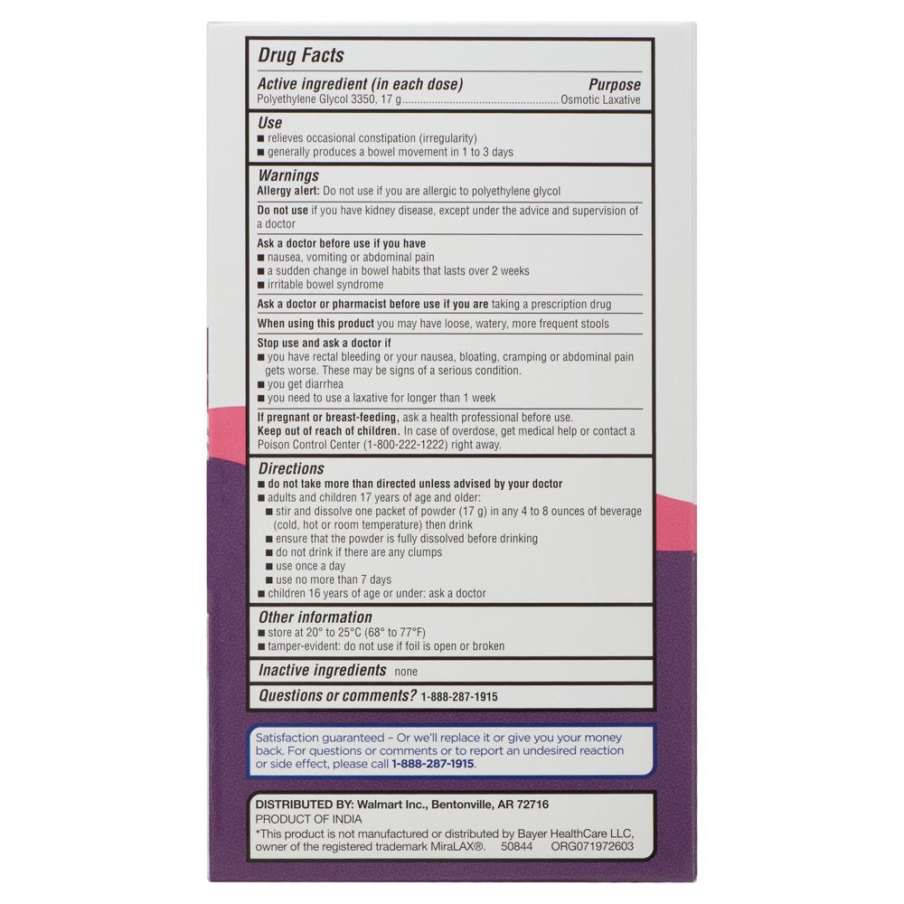 Equate Polyethylene Glycol 3350 Mix-In Laxative Packets, 10 Count is backordered and will ship as soon as it is back in stock.