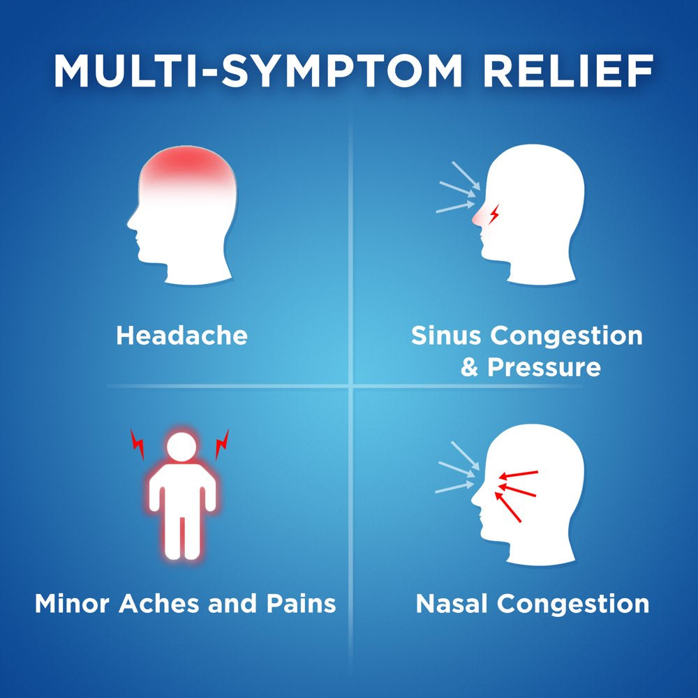 - Temporarily relieves these symptoms associated with hay fever or other respiratory allergies, and the common cold: headache, nasal congestion, sinus congestion and pressure, minor aches and pains, helps decongest sinus openings and passages, promotes sinus drainage, helps clear nasal passages, temporarily reduces fever