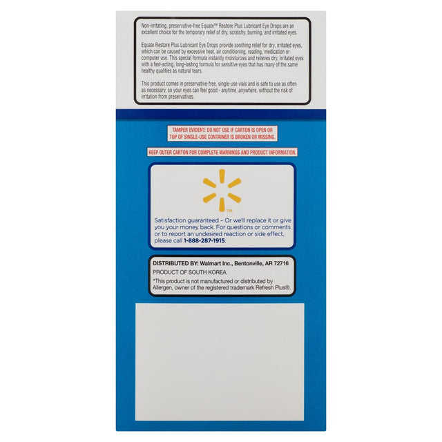 Put LASIK dryness on hold with Equate Restore Plus Carboxymethylcellulose Sodium Lubricant Eye Drops. Our moisturizing drops for LASIK dryness are formulated to provide immediate, long-lasting relief for dry, irritated eyes and may be used as a protectant against further irritation. This preservative-free, sensitive formula is gentle enough for post-operative (e.g., LASIK) dryness and discomfort, making them an excellent choice for when you need relief from burning, irritation and discomfort due to dryness of the eyes or exposure to wind or sun. This product comes in convenient single-use vials, so you can get the relief you need anytime, anywhere. Restore your eyes' much-needed moisture with Equate Restore Plus Carboxymethylcellulose Sodium Lubricant Eye Drops. Making the right health decisions can be challenging. With a complete range of products and simple solutions, Equate allows you to take care of your family with confidence.