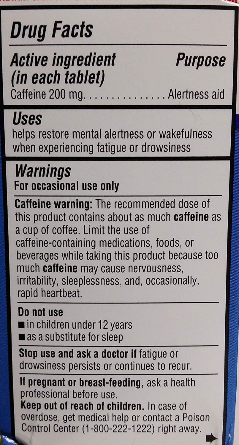 - 200 mg caffeine per tablet, equal to about 2 cups of coffee.
