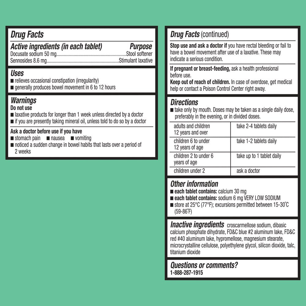 - Active Ingredients: Docusate sodium 50 mg Stool Softener; Sennosides 8.6 mg Stimulant Laxative