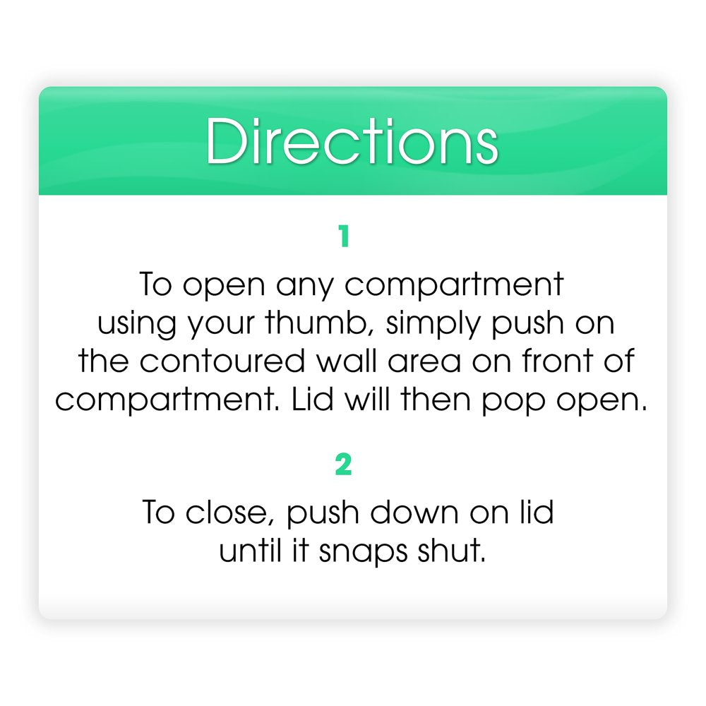 - Lids of each compartment indicate the day of the week by the first 3 letters