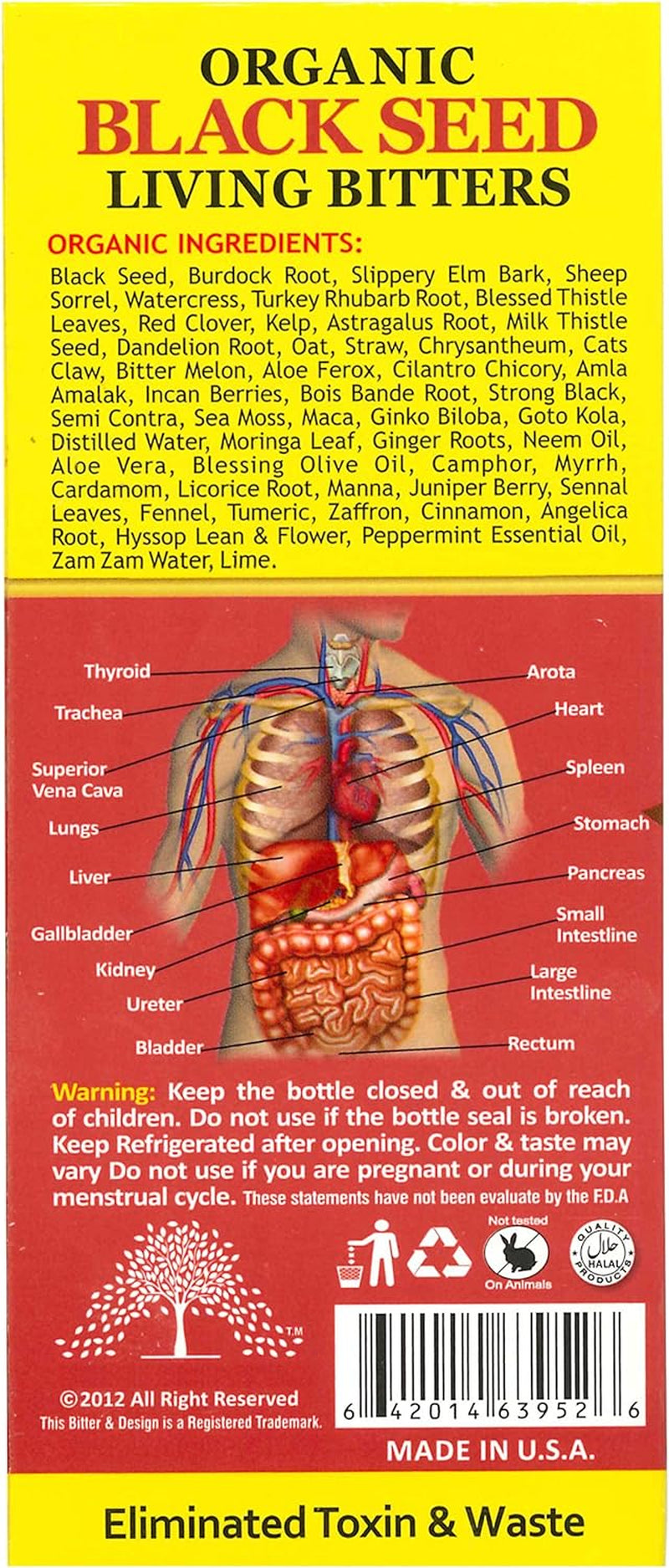 For centuries the organic black seed living bitters have been used by millions of people in Asia, Europe & Africa to support their health. The combination of the organic & natural herbs has been traditionally used for a verity of conditions and treatment related to respiratory health, stomach, intestinal health, circulatory immune system, kidney & liver function.