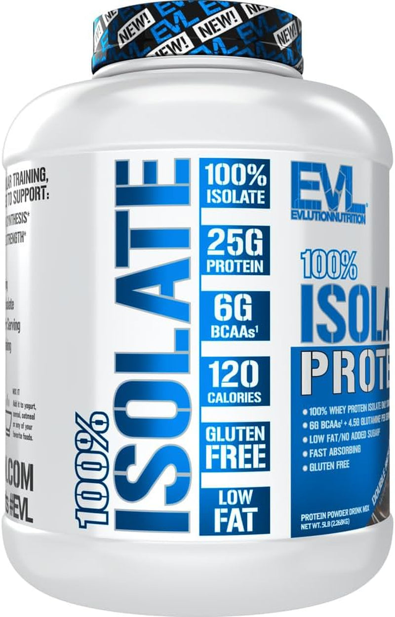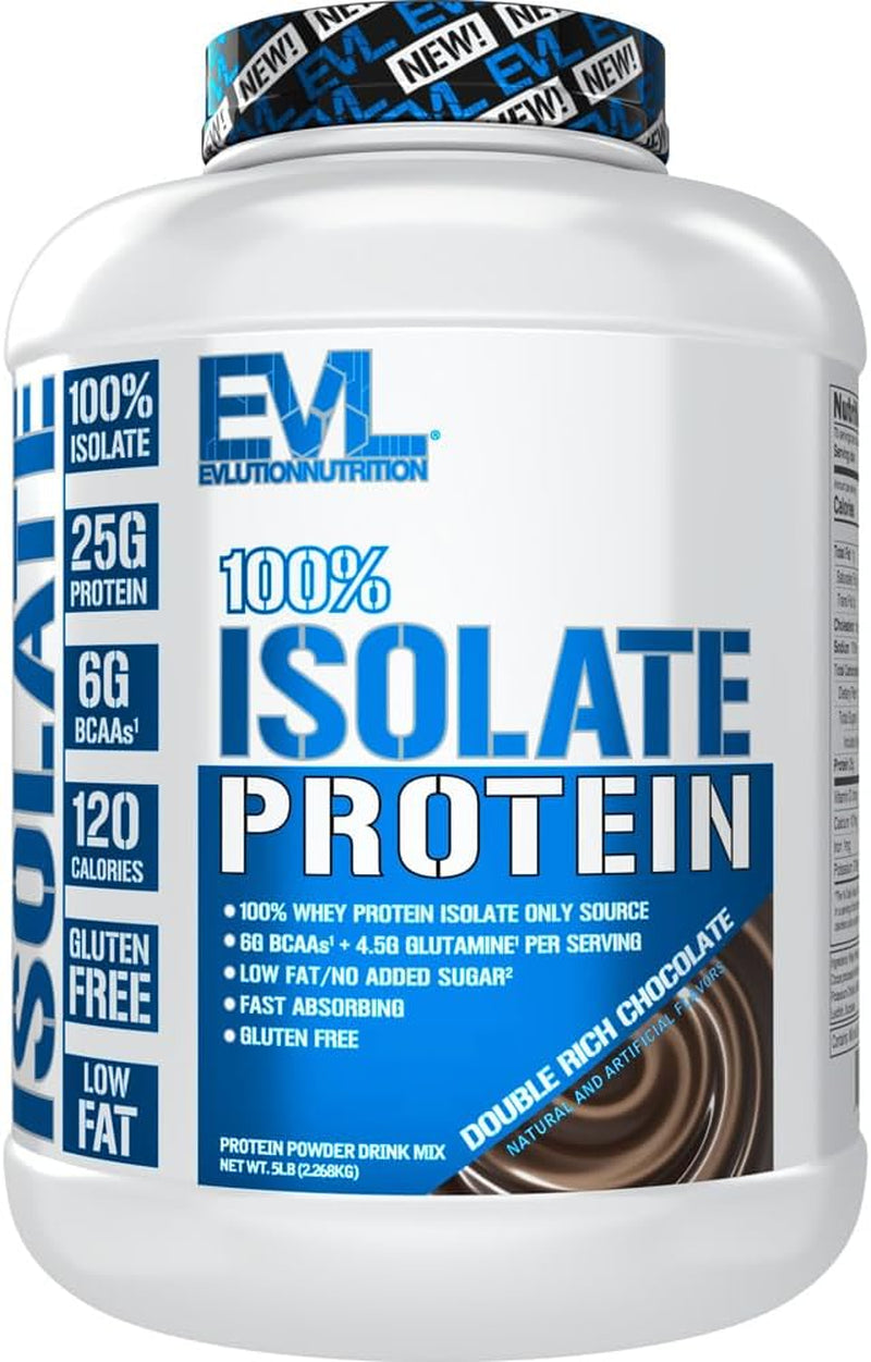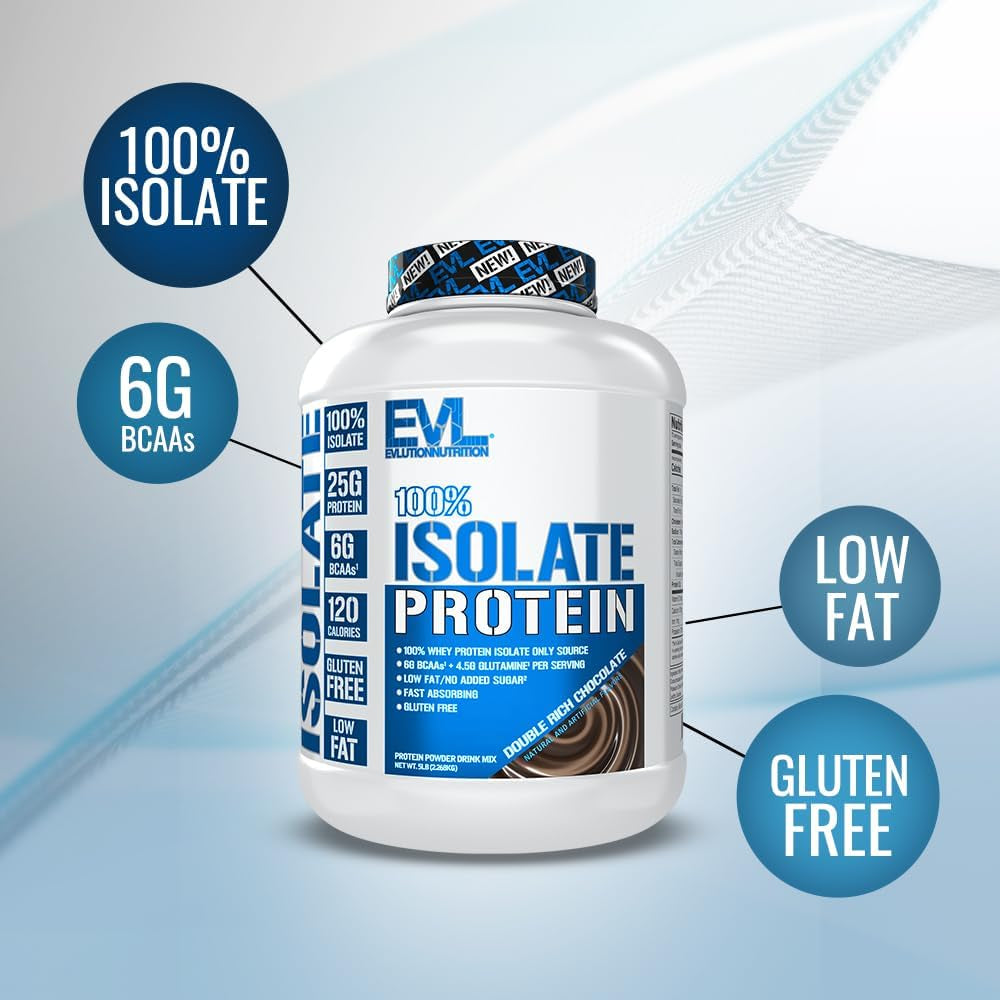 Evlution Nutrition 100% Isolate, Whey Isolate Protein Powder, 25 G of Fast Absorbing Protein, No Sugar Added, Low-Carb, Gluten-Free (Double Rich Chocolate, 5 LB)