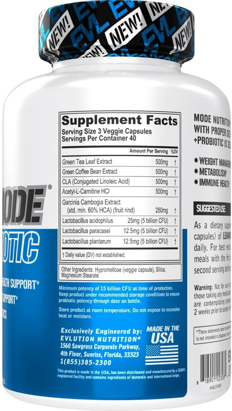 At Evlution Nutrition we make it our mission to provide guys like you with the health and fitness supplements your bodies need to perform at their best. This means we are always looking for new ways to improve our products which is how we came up with our Lean Mode with added probiotics. It's time you reap the benefits of a probiotic supplement paired with an invigorating complex featuring garcinia cambogia extract, green tea extract, green coffee extract, CLA, Acetyl l-carnitine, plus a 15 billion CFU lactobacillus probiotic complex.