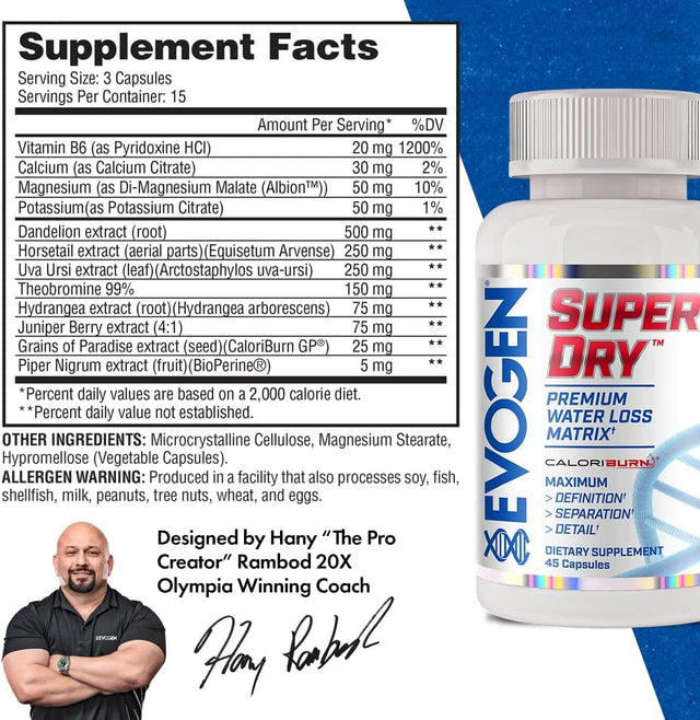 Evogen Nutrition Super Dry | Premium Water Loss, Shredded, Definition, Dandelion, Horsetail, Uva Ursi, Grains of Paradise, Juniper Berry, Bioperine, | 45 Capsules