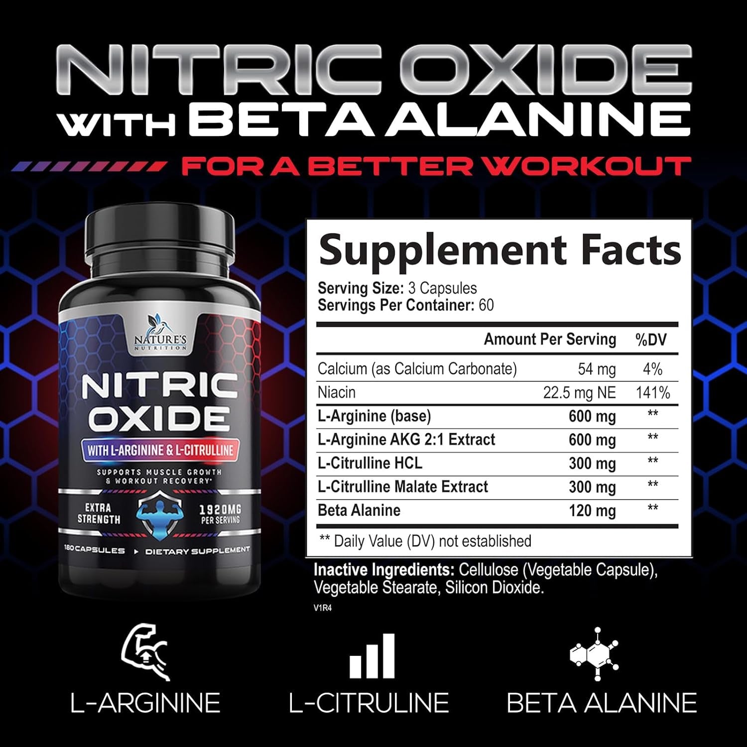 - Nitric Oxide Supplements by Nature's Nutrition: L Arginine supplement for men; extra strength nitric oxide booster capsules with L Citrulline malate; nitrate for post or pre workout pump muscle support growth l-arginine pills bodybuilding builder beta alanine women pill no boost energy support