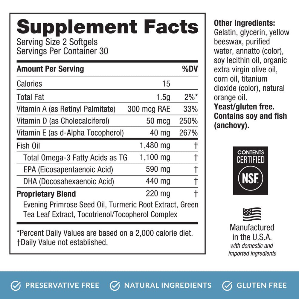 - Natural Ingredients - This vitamin includes natural, ethically sourced ingredients you may recognize like anchovies, green tea leaves, and turmeric. Our highly concentrated fish oil is sourced from the oceans of Chile and put through a patented purification process to ensure quality and freshness. Certified for Responsible Sourcing, Friend of the Sea, and Dolphin Safe, these Omega-3s are as good for the environment as they are for your eyes