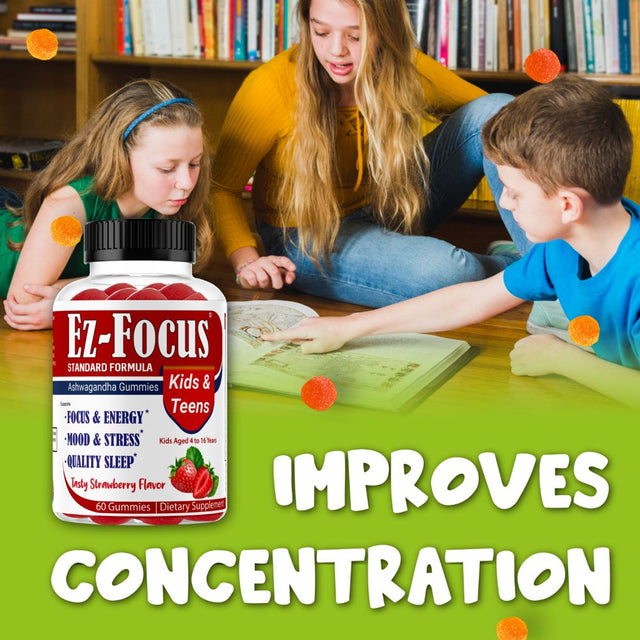 Ez-Focus Brain Booster Gummies for Kids & Teens -Brain Supplement with Omega, Support Focus, Memory, Concentration and Cognition - Vegan, Non-Gmo - 60 Gummies