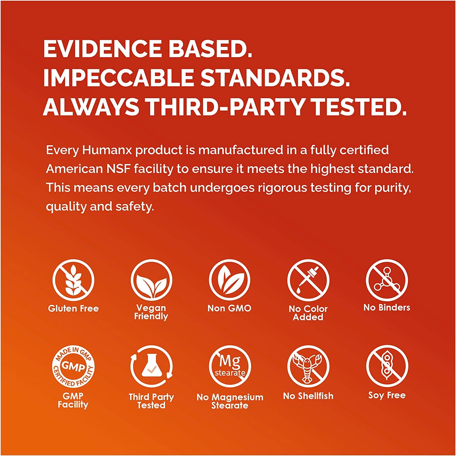 - CRAFTED TO THE HIGHEST STANDARD: Every Humanx supplement is manufactured in a state of the art NSF and GMP certified facility. Each batch undergoes rigorous third party testing for purity and potency to ensure each supplement reaches the highest standard.*