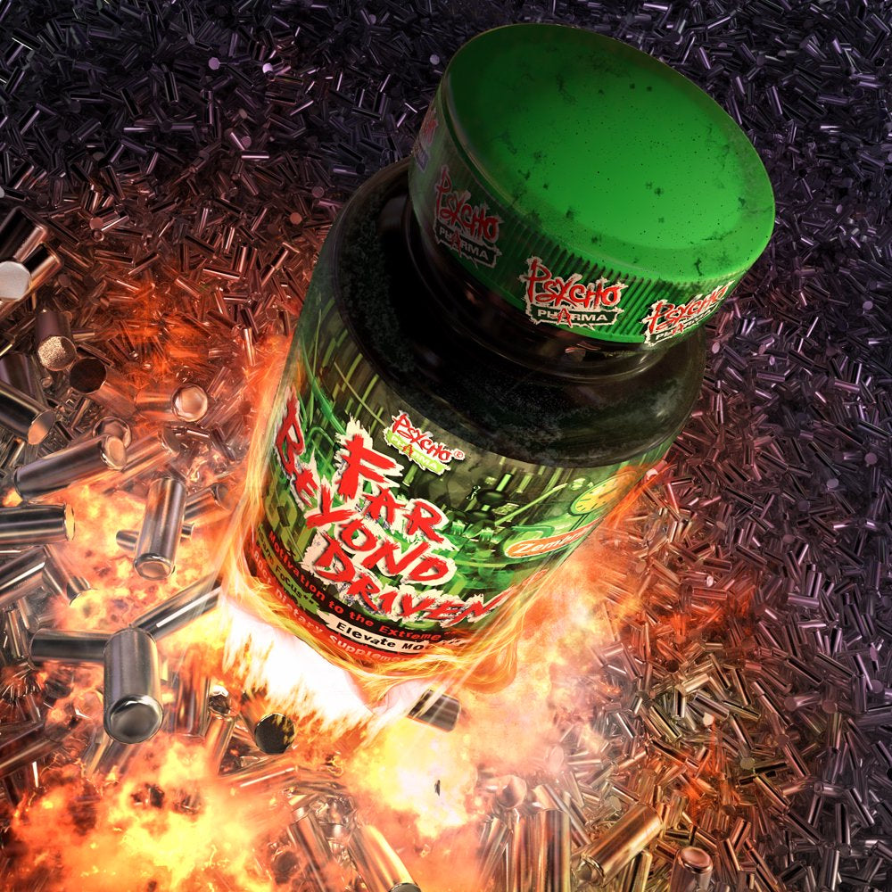 NEW LEVEL POWER, CONFIDENCE, AND STRENGTH BEYOND STRENGTH RESPECT Psycho Pharma's FAR BEYOND DRIVEN! Motivation to Power Far Beyond Goals of Fitness and Strength Far Beyond Driven is the strongest energy product available. It produces a feel-good, happy mood and energy unparalleled by the energy drinks and caffeine supplements found in convenience stores (or vitamin stores) … and without the crash afterward. It combines high levels of caffeine, exotic stimulants and nootropic agents to give users intensity and euphoric energy. For anyone looking for increased energy, enhanced athletic performance, improved mental focus, and cognitive ability or just all-around enhanced positive mood, Far Beyond Driven is the perfect solution. Go all-day. Go all night: Far Beyond Driven helps you power through tough physical work, big boy fitness workouts, and all-night partying or gaming. We don’t slow down until Far Beyond Driven says so!