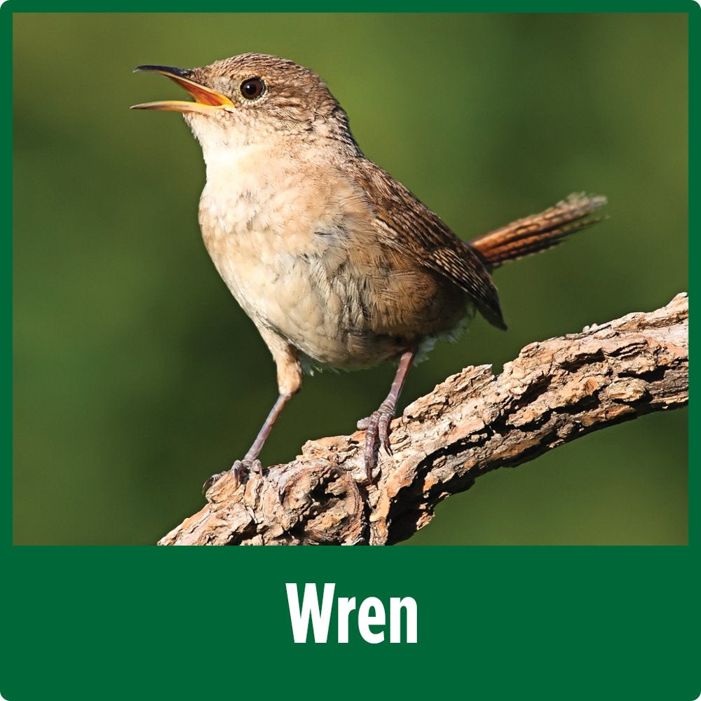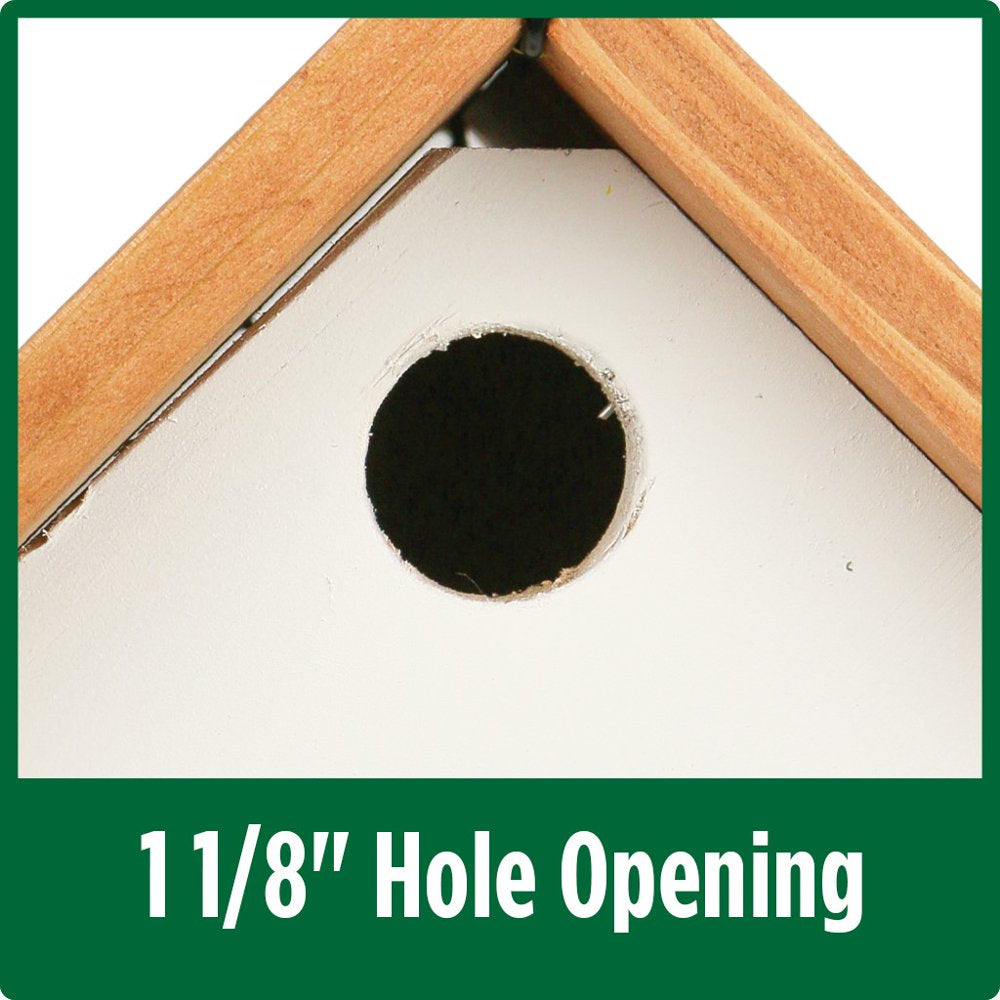 The elegant feel and innovative design of this Farmhouse Wren House are sure to make it a quick favorite! Air vents allow for proper air ventilation through wall and floor openings to promote bird health. Clean-out doors provide easy access for cleaning. This house has a 1 1/8" opening to accommodate both house wrens and chickadees while keeping unwanted larger birds out. Made with naturally insect and rot resistant premium Cedar for a durable house that will last multiple seasons. Vinyl-coated wire hanging cable included.