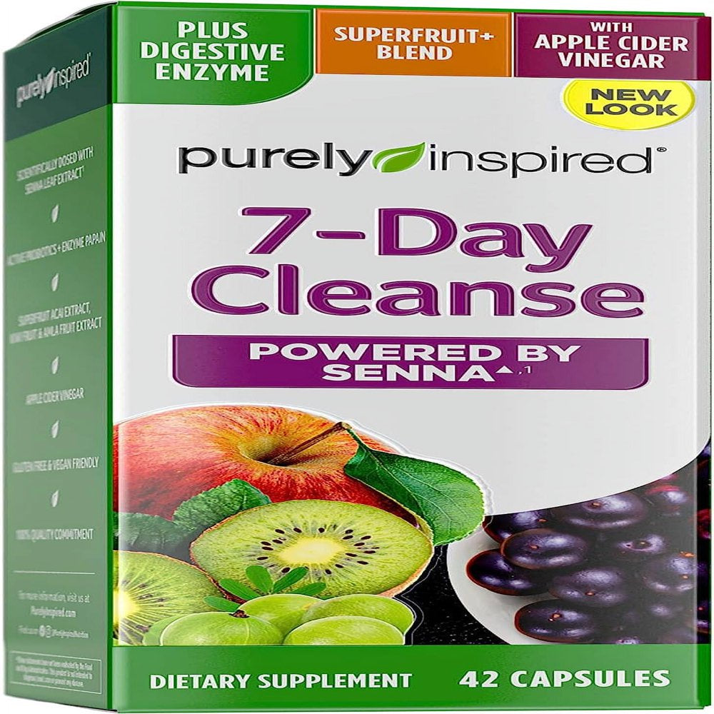 DETOX CLEANSE FOR WEIGHT LOSS Purely Inspired s 7 Day Cleanse is a vegan-friendly formula that offer a unique cleansing experience, providing your body with an effective and gentle flush of excess waste.,Product Note: Exposure to heat or sunlight may lead to melting/damage of product. Hence customers are expected to be available during the product delivery,PROBIOTICS FOR WOMEN WEIGHT LOSS 7 Day Cleanse contains vitamin C. papain a digestive enzyme and LactoSpore (bacillus coagulans) probiotic.,ACAI BERRY CLEANSE 7 Day Cleanse features acai fruit extract, kiwi fruit, apple cider vinegar and senna leaf for the ultimate Cleansing plus Superfruit plus Digestive Blend available.,APPLE CIDER VINEGAR AND SENNA LEAF 7 Day Cleanse is an herbal mix formula that includes cleansing support from senna leaf extract, which works with your body s natural elimination process.