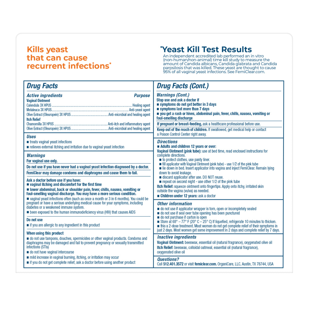 FemiClear 2 Day Yeast Infection Treatment is a fast-acting two-day yeast infection treatment that is proven to kill 99% of yeast. FemiClear was made with only all-natural, organic ingredients so you can feel confident about treating your yeast infection without the use of artificial antifungals or chemicals used in other yeast infection treatments. Use at bedtime for the best experience. Average 4-hour time-kill of Caliban's, C. Glabrata, and C. Para psilosis.