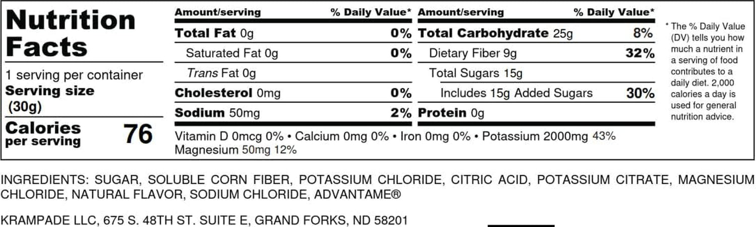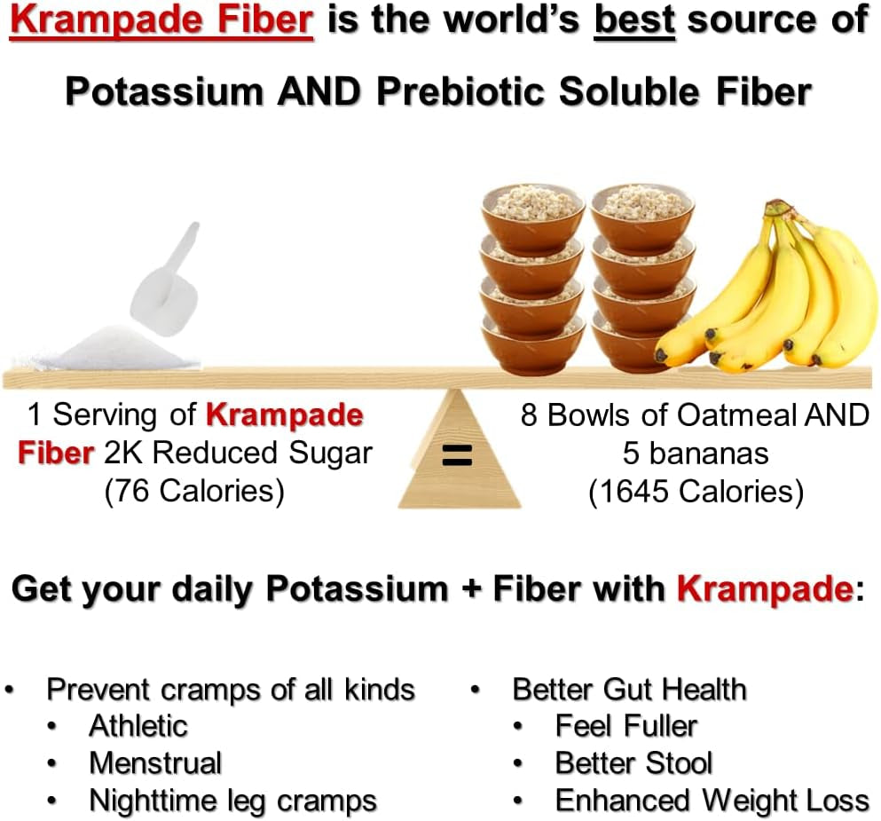 Krampade Fiber 2K is great for helping individuals meet their potassium and dietary fiber recommendations. Krampade Fiber 2K contains 2,000 mg of potassium and 9 g of soluble fiber, about 2x the content of soluble fiber per serving compared to the leading fiber supplement.