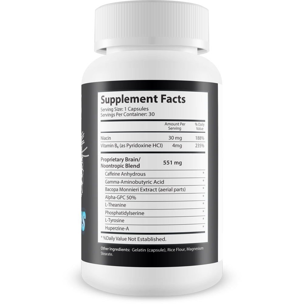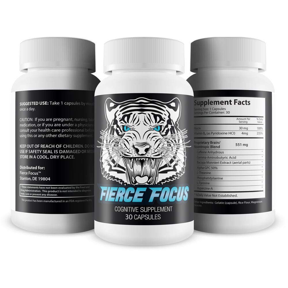 Fierce Focus helps maintain a healthy emotional balance and supports the body's natural ability to stabilize mood. With a calm mind you are able to focus more clearly and completely. Our formula is designed to increases blood, circulation, and oxygen to the brain, which promotes healthy, energized brains cells and neurons. It contains clinically studied ingredients that have shown to support healthy brain function and memory while reducing hyperactivity; Niacin, Vitamin B6, Caffeine, GABA (Gamma-Aminobutyric Acid),Bacopa Monnieri Extract, Alpha-GPC, L-Theanine, Phosphatidylserine, L-Tyrosine, & Huperzine-A.