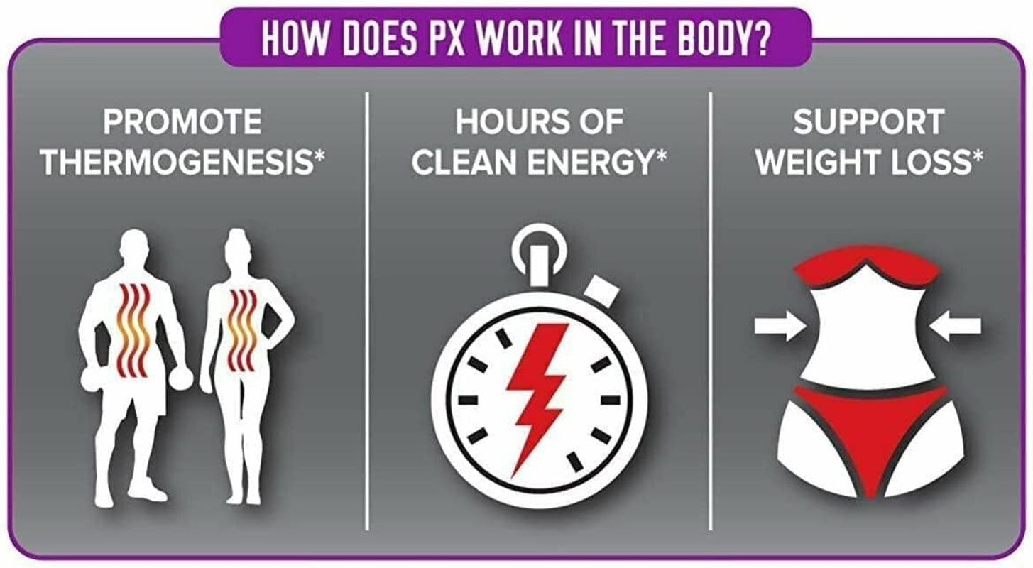 How To Use PXAs a dietary supplement take 1 serving (1 capsule) of PX 1-2 times daily. Take 1st serving of PX immediately upon waking. Take 2nd serving 6 hours later. Do not consume more than 2 servings daily. | Who Should Try PX Pro Xanthine?If you're looking to lose weight, boost your energy, enhance your focus, or just give yourself a daily boost, PX was made with YOU in mind! | Making It EASYOne pill provides the energy, focus, and appetite suppression needed to get you through the day. PX PRO is designed to replace at least 3 supplements you're already using. | More Focus, More ProgressInstead of turning to junk food or sugary treats for energy, PX Pro Xanthine is an all-natural solution for weight loss. This natural supplement promotes an overall sense of well-being so cravings are easier to curb. |