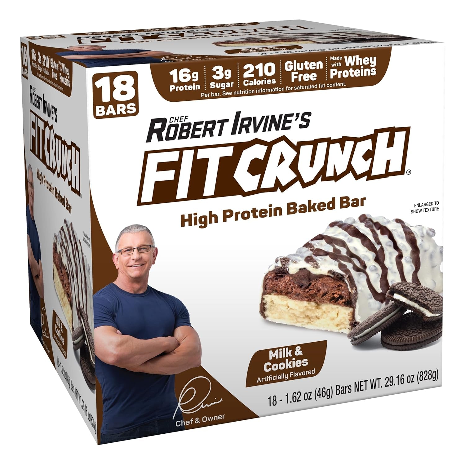 FITCRUNCH Snack Size Protein Bars, Designed by Robert Irvine, World’S Only 6-Layer Baked Bar, 3G of Sugar & Soft Cake Core (18 Bars, Milk and Cookies)