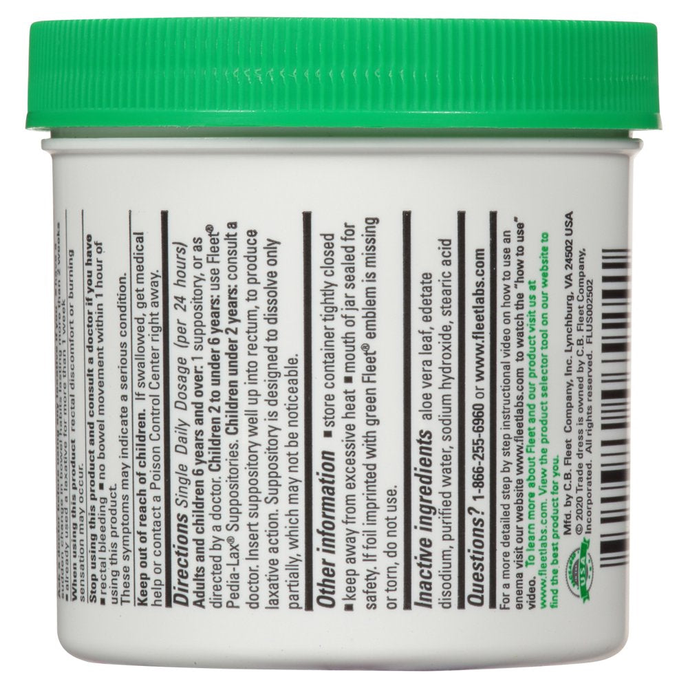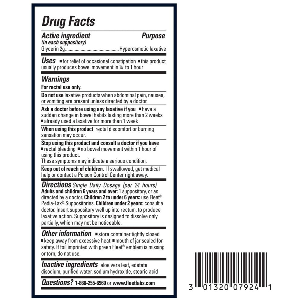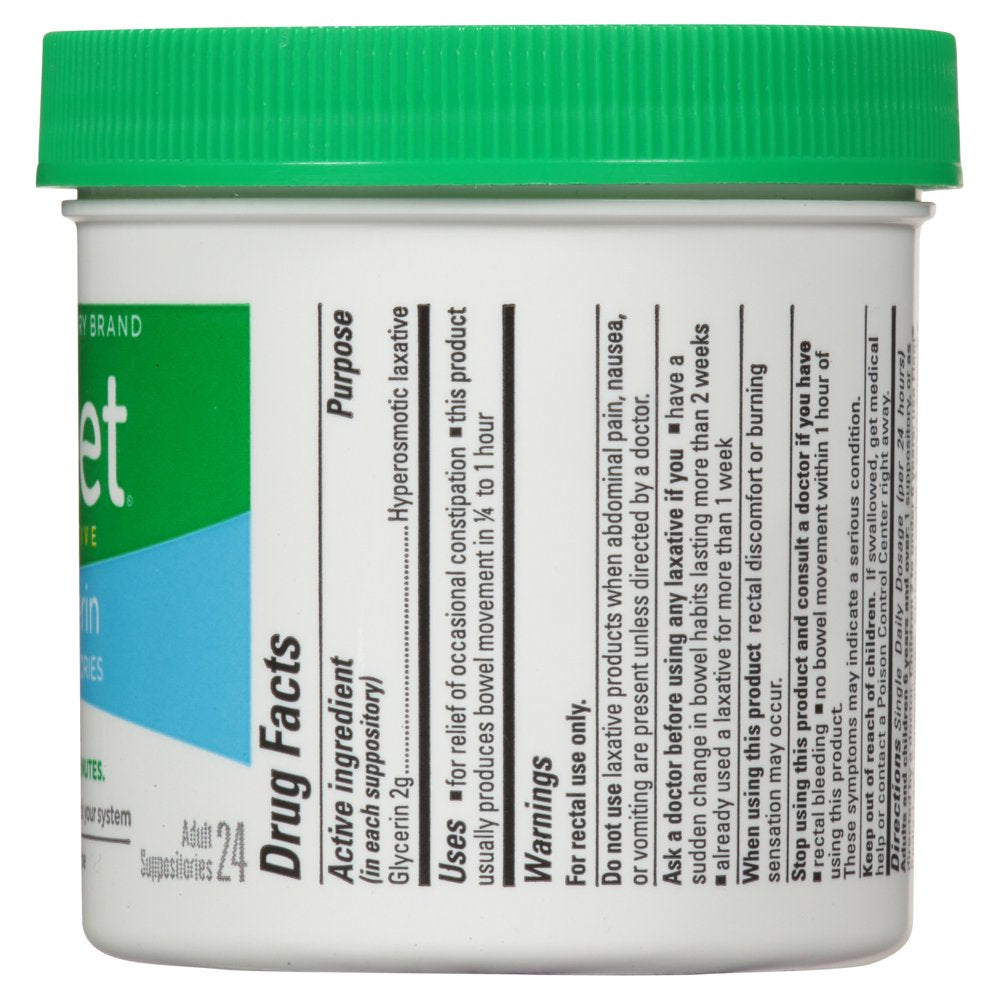 Fleet is the number 1 doctor-recommended brand for enemas(1). With Fleet Glycerin Suppositories, you get gentle constipation relief in minutes. Glycerin Suppositories are formulated with aloe and are a convenient alternative for those who prefer not to use a liquid enema for adult constipation. The suppository is easily inserted rectally, allowing it to act locally in the colon without having to go through the entire digestive system and is a good option for stimulant-free relief. The suppository is designed to partially dissolve, which may or may not be noticeable. Fleet Glycerin Suppositories work by attracting water into the colon, making it easier to promote a bowel movement. Our glycerin suppositories are ideal for gentle relief for those who suffer from occasional constipation. Free yourself from discomfort caused by adult constipation within 15 minutes to 1 hour with Fleet Glycerin Suppositories. (1)IRI data, 52 wks ending 1.29.23.