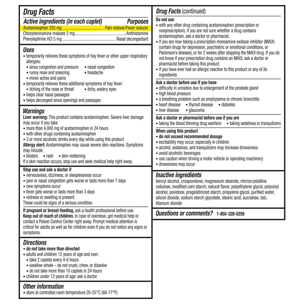 - Contains pain reliever acetaminophen 650 mg, antihistamine chlorpheniramine maleate 4 mg, nasal decongestant phenylephrine HCl 10 mg per 2 caplet dose