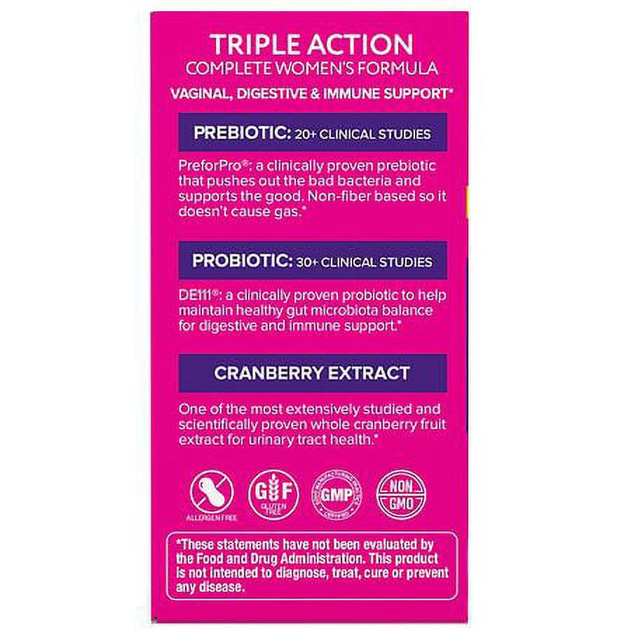 - TRIPLE ACTION FOR WOMEN: A complete triple action women’s health formula combines the next generation of PREBIOTIC + PROBIOITIC strains and a scientifically proven whole CRANBERRY extract for vaginal, digestive, immune, and urinary tract health.