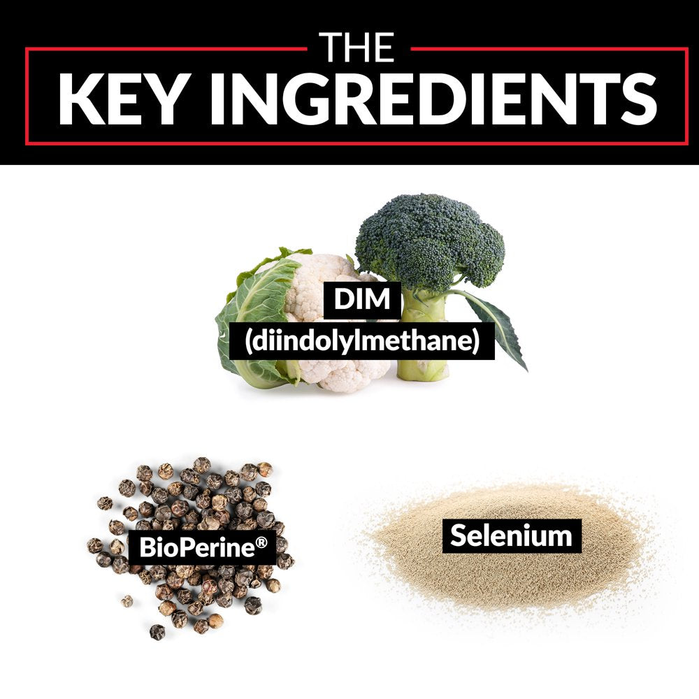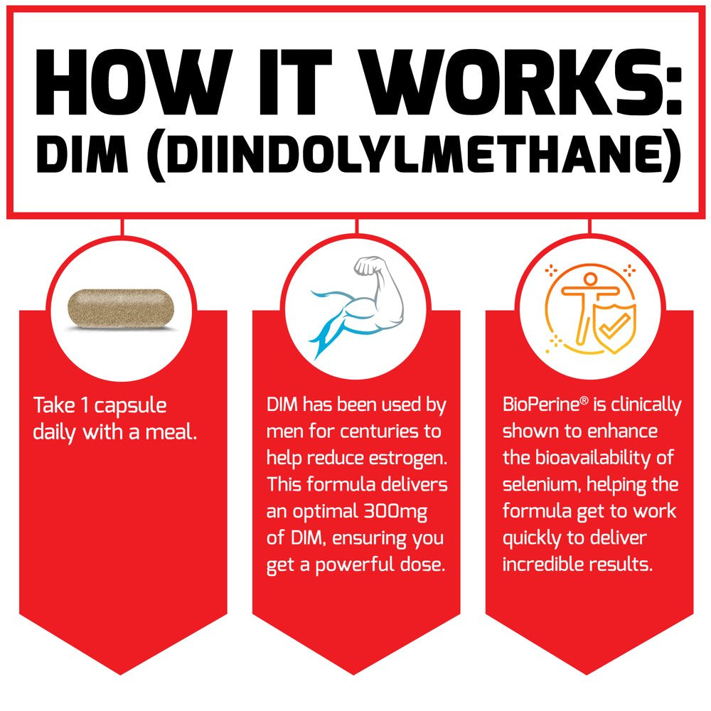 THE ESTROGEN PROBLEM DIM, or diindolylmethane, is a unique compound found in small amounts in cruciferous vegetables like broccoli, kale, and cauliflower. What makes it special is its widespread traditional use to decrease estrogen levels in men. At concentrated amounts, DIM is thought to work by inhibiting the enzyme responsible for converting testosterone into estrogen in the body. Throughout history, men have wanted to exhibit lower levels of estrogen relative to testosterone in an effort to maximize their masculinity. With 300mg of high quality DIM in every capsule, along with BioPerine® black pepper fruit extract and selenium, you can rest assured that you are getting a powerful dose and quick absorption for optimal performance. FUNDAMENTAL STACKING All of the Force Factor® Fundamentals formulas were designed to stack together, as well as with any other supplement in our full line of premium performance nutrition products.