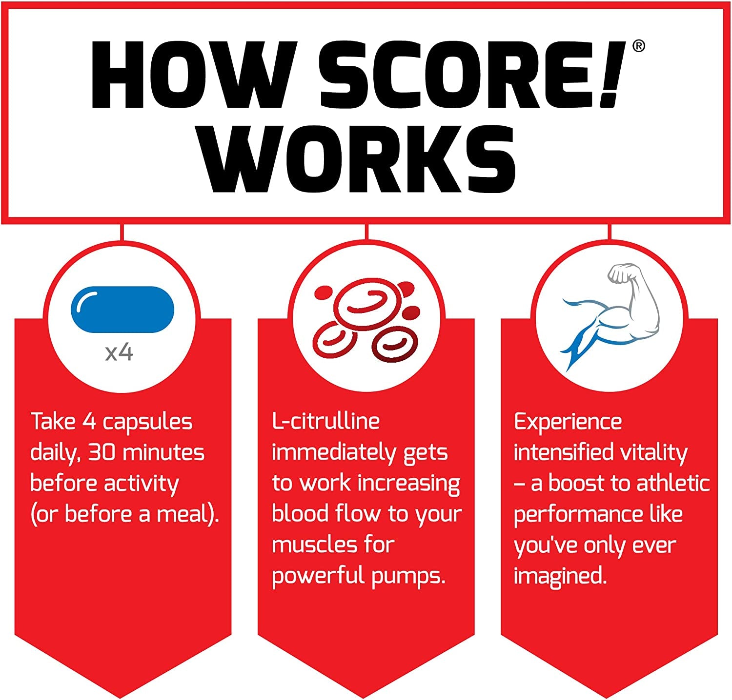 - BOOST NITRIC OXIDE LEVELS: Amplifying blood flow during strength training is the key to powerful muscle pumps, and nothing does this better than increasing your nitric oxide (NOx) levels. SCORE! contains a substantiated dose of the amino acid L-citrulline to improve circulation where and when you need it most.