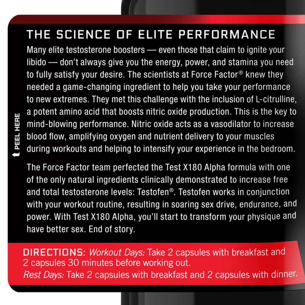 Force Factor Test X180 Alpha® Testosterone Booster delivers the fuel the body needs to reach the pinnacle of sexual and physical performance. The clinically researched ingredient Testofen® works during strength training to boost the body's free testosterone levels for dramatic increases in libido, strength and stamina. The L-citrulline in Test X180 Alpha catalyzes the production of nitric oxide for increased blood flow throughout the body, helping to maximize performance and boost energy and endurance. Both ingredients are safe and effective. Force Factor Supplements help build lean muscle mass when paired with diet and working out.