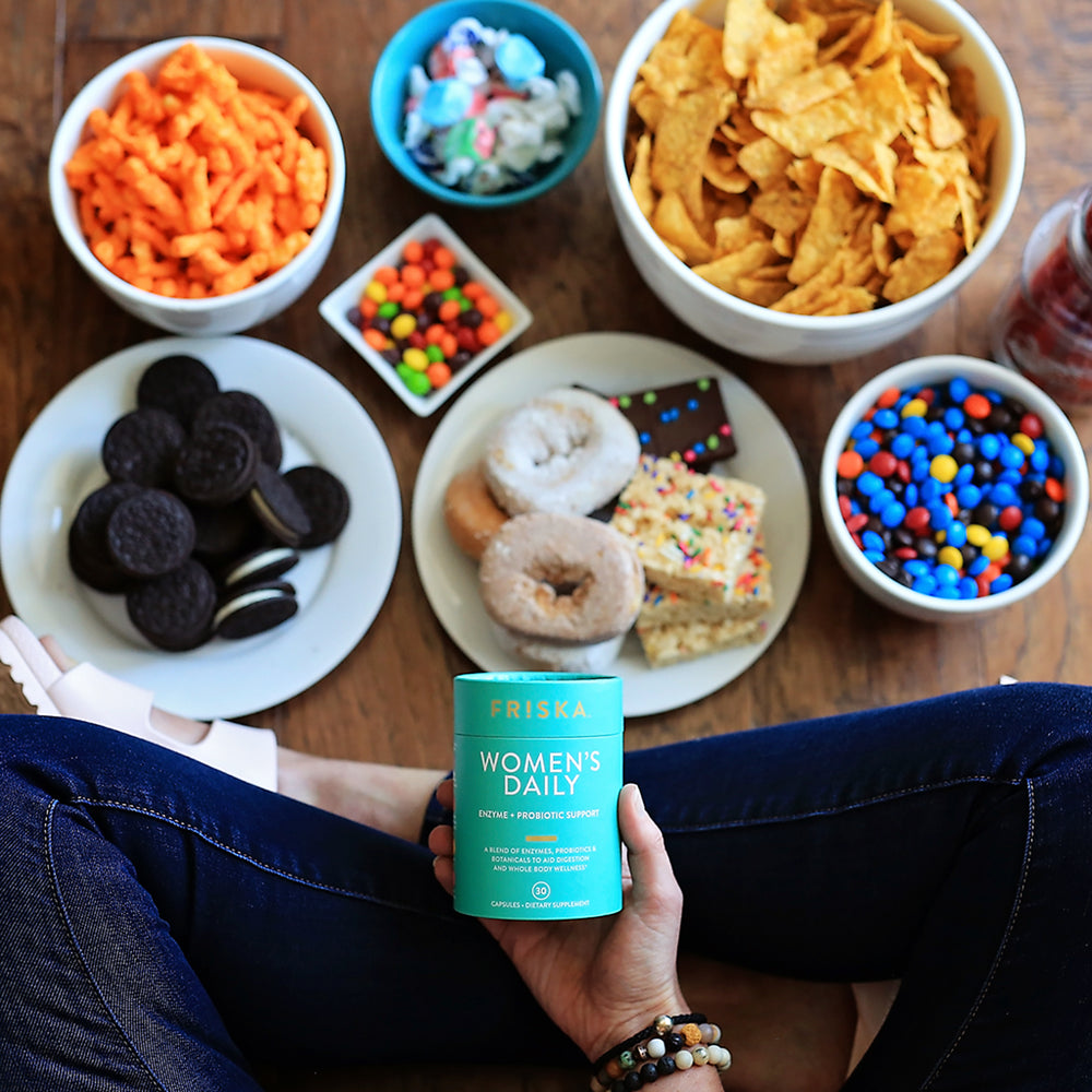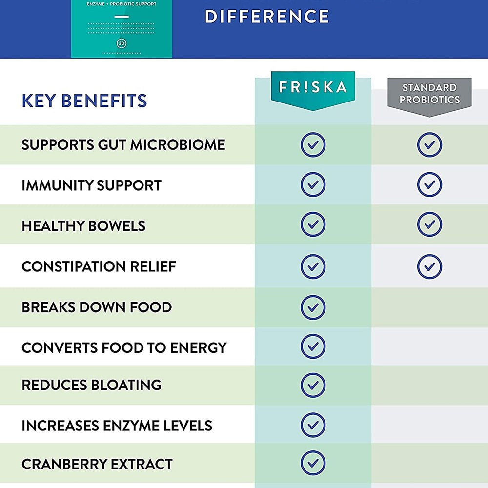 - YOUR BELLY'S NEW BFF: FRISKA's proprietary digestive enzyme blend and potent probiotics are formulated to help break down nature’s major energy sources—carbohydrates, proteins, and fats—while improving digestion for overall health. Use daily.