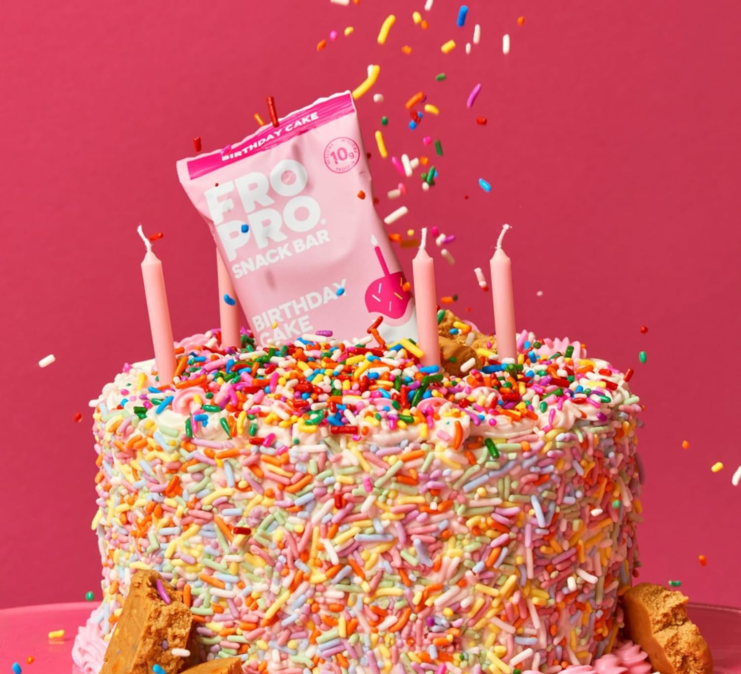 - BIRTHDAY CAKE: No one is going to pop out of this cake and sing to you. The rainbow sprinkles MIGHT sing to you — but only metaphorically. We’ve also heard that people dance when they pop out of birthday cakes as well! Either way, with FRO PRO, even if it isn’t your birthday — it still kind of is! Don’t forget to blow out your candles!