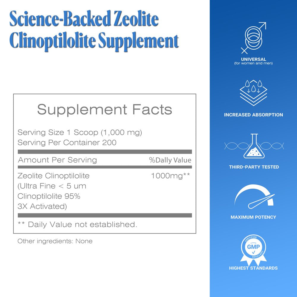 - ANTIOXIDANT: The zeolite crystal surface is negatively charged, making it a rich electron donor that helps neutralize positively charged unstable atoms in the cells. Zeolite Detox Powder stimulates cell protection enzymes - superoxide dismutation and glutathione.