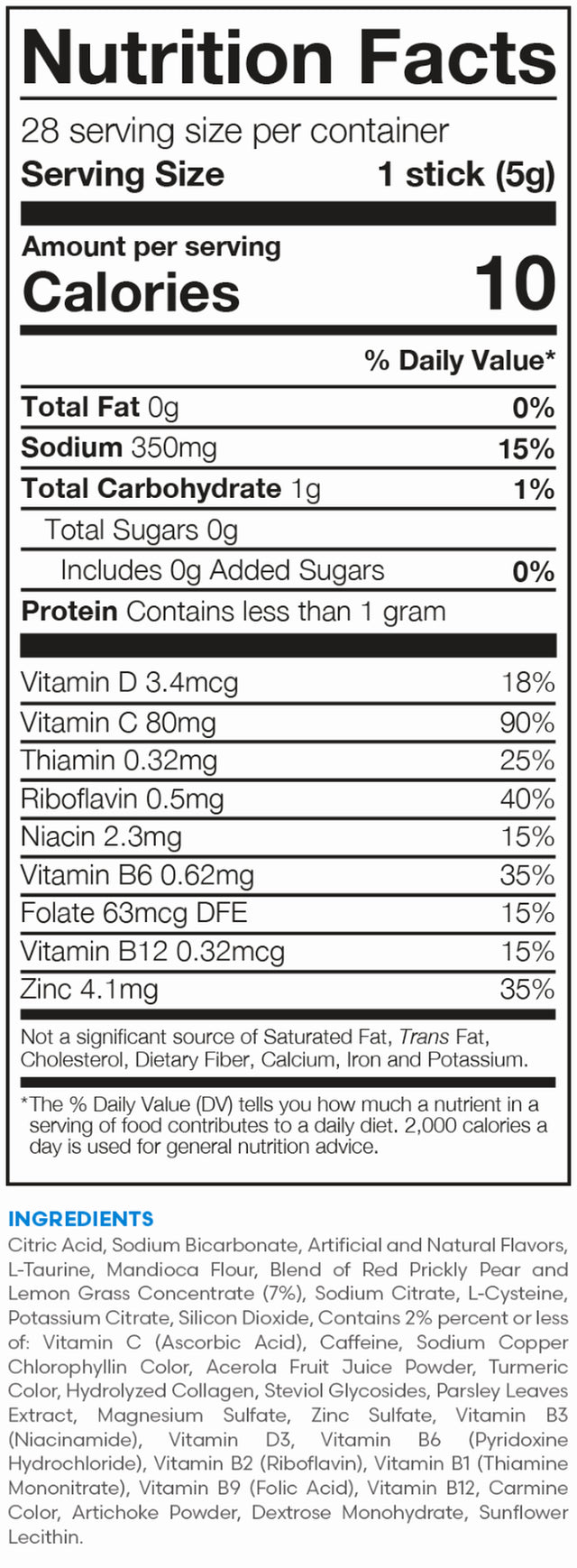 PLANT EXTRACTS MIX (RED PRICKLY PEAR, LEMONGRASS, CHLOROPHYLL, ACEROLA, TURMERIC, PARSLEY, ARTICHOKE), PEPTIDES AND AMINO ACIDS MIX: HYDROLYZED COLLAGEN, TAURINE, CYSTEINE, VITAMINS AND MINERALS MIX: B COMPLEX (VIT B1, B2, NIACIN, B6, B9 (FOLIC ACID), B12), MAGNESIUM, ZINC.