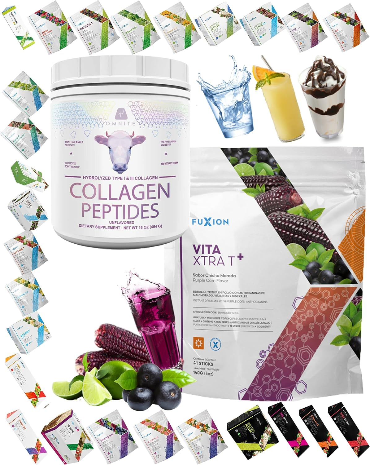 Fuxion Vita Xtra T (41 Sachets) - Long Lasting Energy Boost W. Natural Enhancers,Plus Omnite Unflavored Collagen Peptides 1 Canister (41 Scoops),Perfect to Drink Together