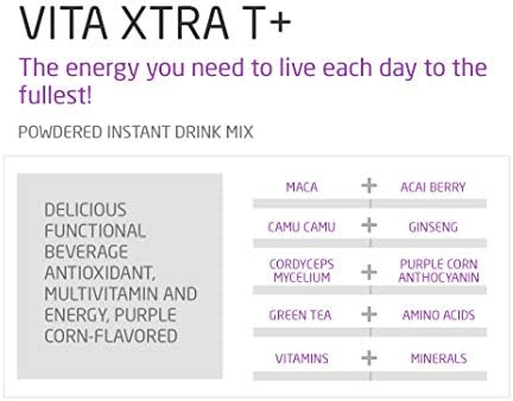 About this item Special blend of vitamins, minerals, fruit extracts and antioxidants.Guayusa, a plant from the Amazon, that will help you stay alert longer. Help you to receive a long-lasting energy boost that will last the whole day, while reducing cellular oxidation.Together with natural enhancers like cordyceps mycelium and goji berry, which prolong the revitalizing effect of this drink. Product description: VITA XTRA T+ This unique antioxidant, multivitamin, and multimineral drink is a powerful nutritional source to give you physical energy and vitality. This incredible formula will help you to receive a long-lasting energy boost that will last the whole day while reducing cellular oxidation. Itβs packed with goodness, including a special amino acid mix including L-arginine. It also contains our special blend of vitamins, minerals, fruit extracts, and antioxidants, including green tea, acai berry, purple corn anthocyanin, Camu Camu (60 times more vitamin C than lemon or orange), Maca, and Lutein (marigold extract).