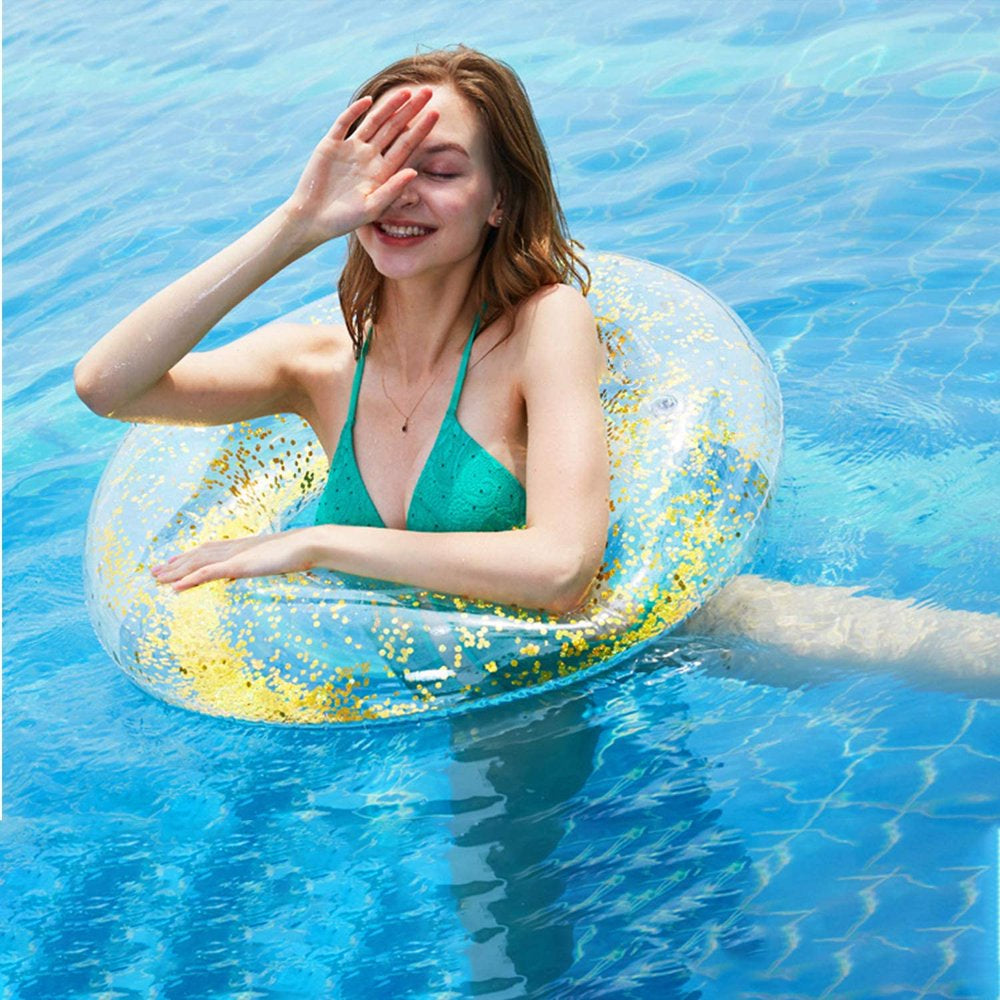 - 【SHINE WITH YELLOW SEQUINS】: swim ring for pool is bright, shiny, and attractive. This yellow pool float features shimmery yellow sequin material and is filled with moving glitter that sparkles in the sunlight. It is crystal clear transparent on the top and on the bottom to enjoy the cool water time. High-quality production technology ensures that the color on it does not fall off. This is specially designed so that it can float smoothly on water surface.