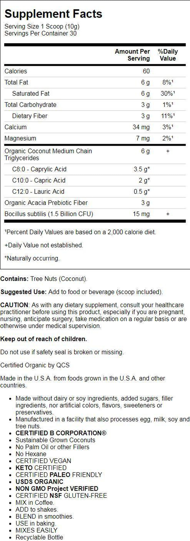 Medium Chain Triglycerides (MCTs) are naturally found in coconut oil and are quickly digested, absorbed and converted into energy for the body and brain. Our Organic MCT Powder is the perfect addition to your Keto pantry while providing convenience—no messy oil to deal with. This makes it perfect for travel or those on-the-go—just throw it in your luggage or gym bag.