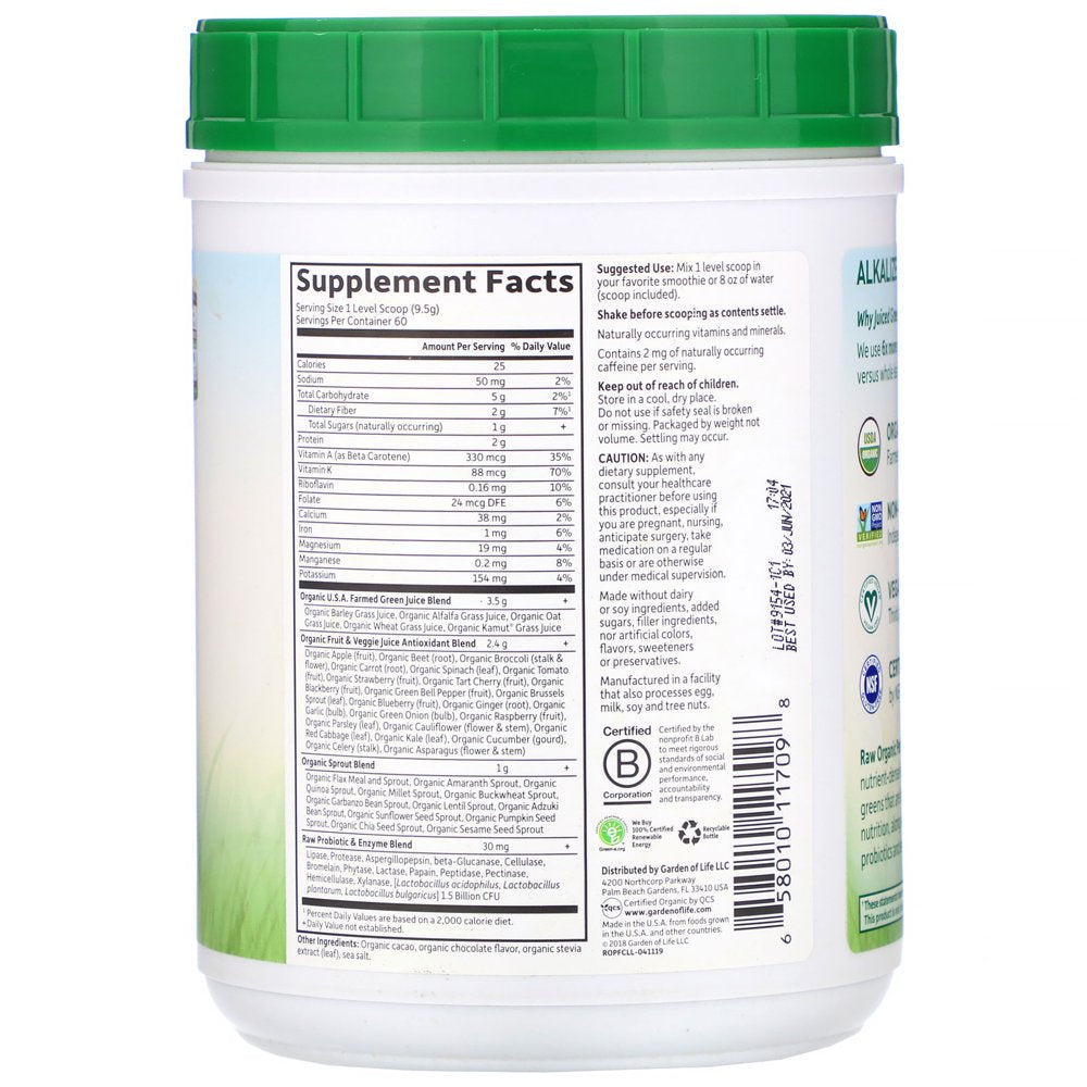 Green Superfood, Chocolate Cacao, Raw Perfect Food, Organic, Jar 23.8 OZ Whole Food Dietary Supplement. Juiced greens powder. USDA organic. Non GMO Project verified. nongmoproject.org. Alkalize. Detoxify. Energize. Vegan. Soy free. Gluten free. No stevia. Contains no filler ingredients, no artificial colors, flavors, sweeteners or preservatives. Certified B Corporation. Certified by the nonprofit B Lab to meet rigorous standards of social and environmental performance, accountability and transparency. Certified organic by QCS. www.gardenoflife.com. Certified renewable energy. Green-e.org. We buy 100% certified renewable energy. Recyclable bottle. Organic grass juice powders are naturally energizing and power-packed with chlorophyll, vitamins and minerals. Juicing our greens super-concentrates them. One serving of Raw Organic Perfect Food instantly delivers 6x more nutrient density than whole leaf grass powder. Raw Organic Perfect Food is packed with 40 nutrient-dense greens, sprouts, fruits & veggies, plus live probiotics and enzymes. Certified vegan. Vegan.org. Grass Juices: Freshly harvested, juiced and low-temperature dried to lock in nutrition. Certified gluten-free by NSF. Organic Matters: Farmed without the use of toxic pesticides or herbicides. Non-GMO Verified: Independent third party verification. Raw Whole Food: Wheat and processing can affect nutrients. No Junk: Gluten, soy & dairy free. No added sugars, no artificial flavors or sweeteners. Dairy free. Grasses grown on our family farm in Utah. (These statements have not been evaluated by the Food and Drug Administration. This product is not intended to diagnose, treat, cure or prevent any disease.) Made in the USA from foods grown in the USA and other countries. Suggested Use: Mix 1 level scoop in your favorite juice, smoothie or 8 oz of water (scoop included). Shake well before each use. Packaged by weight not volume. Settling may occur. Store in a cool, dry place. Do not use if safety seal is broken or missing. Keep out of reach of children. Caution: As with any dietary supplement, consult your healthcare practitioner before using this product, especially if you are pregnant, nursing, anticipate surgery, take medication on a regular basis or are otherwise under medical supervision. 23.8 oz (1 lb 8 oz) 675 g 4200 Northcorp Parkway Palm Beach Gardens, FL 33410 2016 Garden of Life LLC