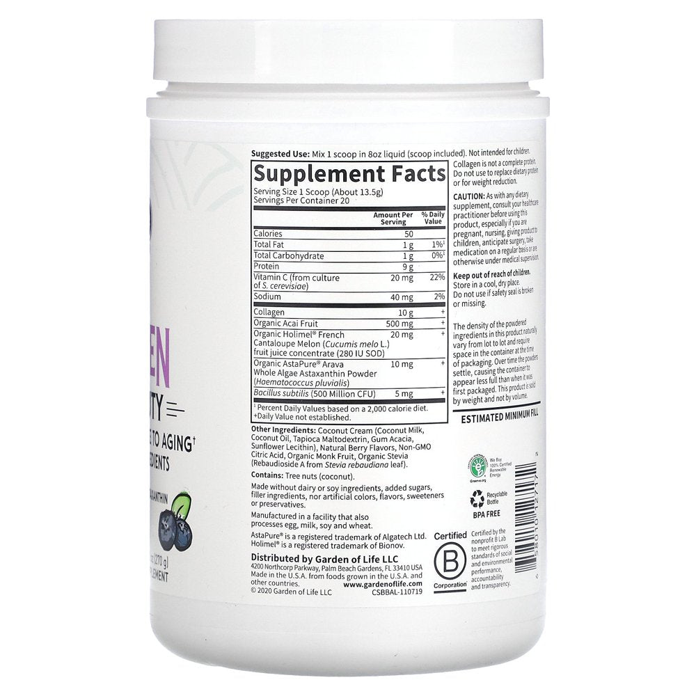 Garden of Life - Grass Fed Collagen Super Beauty Powder 20 Servings Blueberry Acai - 9.52 oz. (270 g) Who doesn't want more youthful looking skin and better resistance to aging? Collagen Super Beauty contains clinically studied and organically grown Holimel French Melon extract, astaxanthin and vitamin C—ingredients proven to boost your skin's elasticity and resistance to UVA- and UVB-related skin aging.