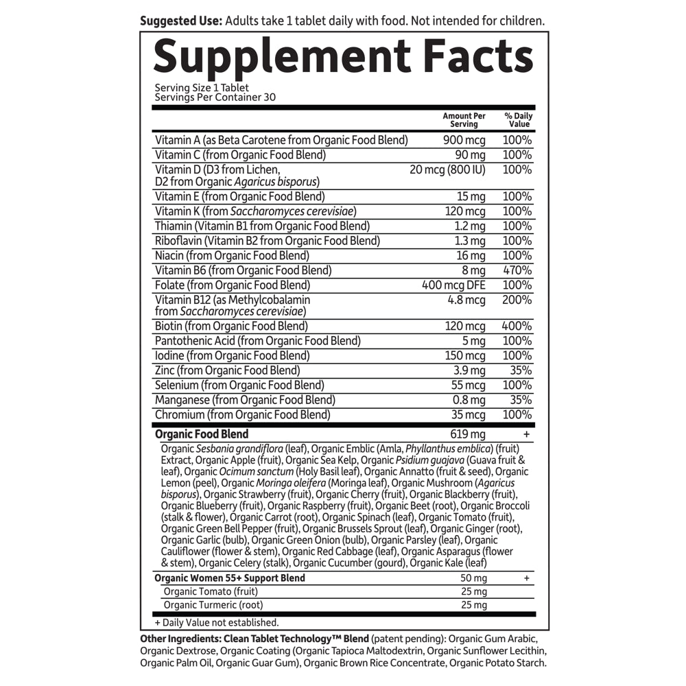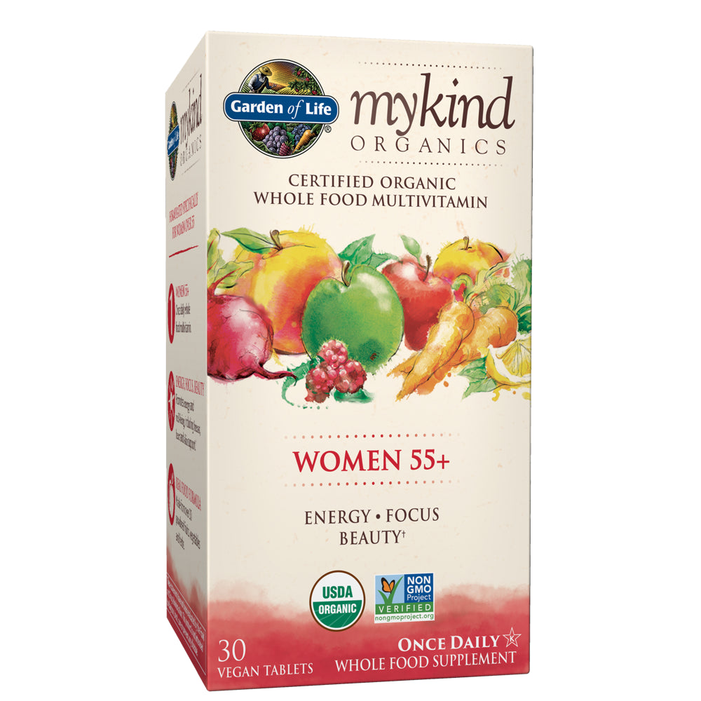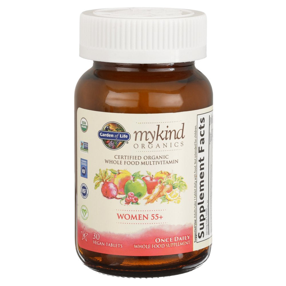 Garden of Life Mykind Organics Women 55+ Multivitamin 30ct is a whole food supplement made from real, nutritious foods and formulated for the specific needs of Women over 55. Each tablet is packed with over 30 organic fruits, veggies, and herbs as well as 18 vitamins and minerals. This unique organic blend provides 200% of the daily value of Vitamin B-12 and Vegan D3 from lichen, providing perfect energy support for your active lifestyle. Garden of Life Mykind Organics Female 55+ Multivitamins are Certified Vegan, NSF Certified Gluten Free, Certified USDA Organic and Non-GMO Project Verified.