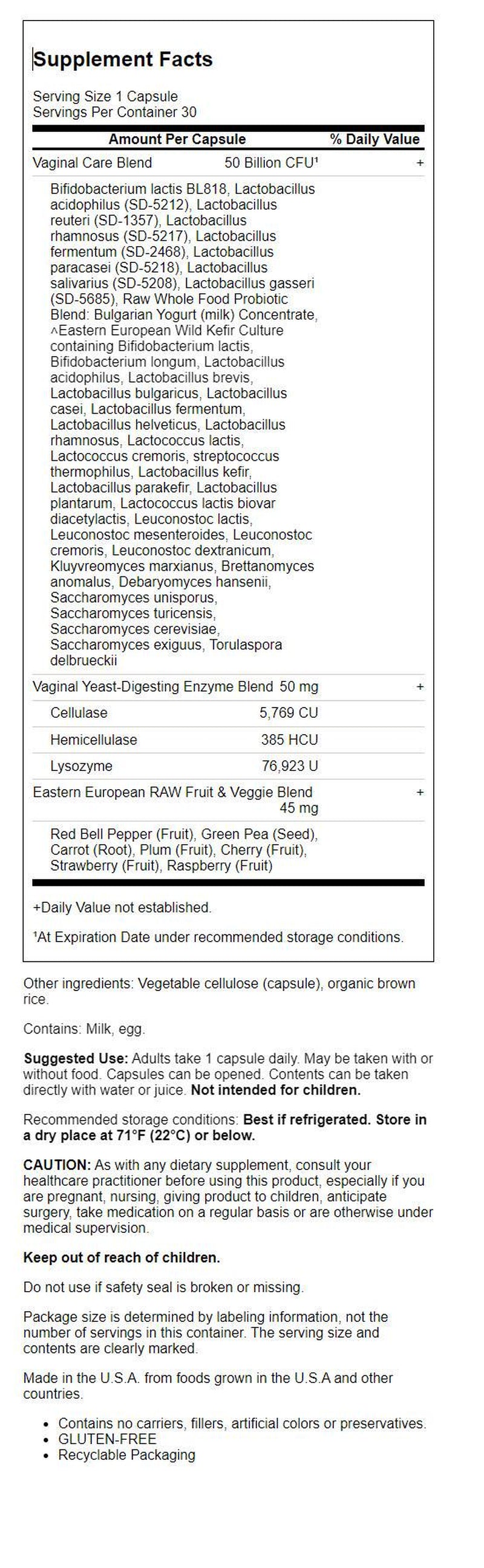Garden of Life - Raw Probiotics Vaginal Care 38 Probiotics Strains - 30 Vegetarian Capsules Garden of Life Raw Probiotics Vaginal Care 38 Probiotics Strains helps maintain a healthy bacterial balance that promotes vaginal and urinary tract health. Garden of Life, RAW Probiotics Vaginal Care is a high potency, RAW, whole food probiotic formula containing a proprietary Vaginal Care Blend featuring eight probiotic strains providing meaningful vaginal and urinary tract health support. Once daily serving small, easy-to-swallow capsule 38 RAW probiotic strains promoting flora diversity as found in nature. Features proprietary Vaginal Care Blend to promote yeast balance, vaginal and urinary tract health Provides a unique Yeast-Digesting Enzyme Blend to help break down yeast cell walls. Helps alleviate symptoms of occasional gas, bloating, constipation and diarrhea. RAW Probiotics is an innovative line of RAW, Whole Food Probiotic formulas from Garden of Life.