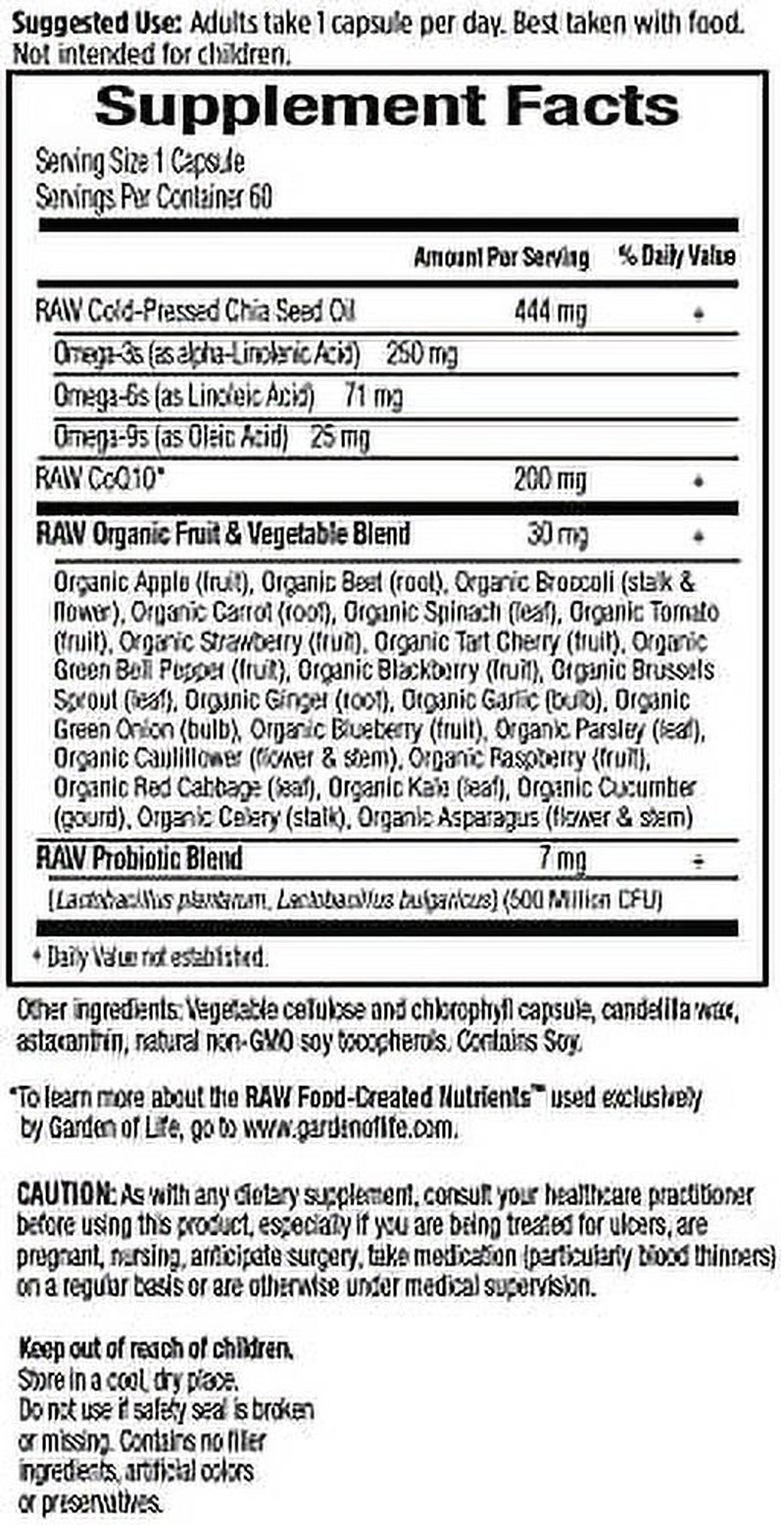 Garden of Life Vegetarian Omega 3 6 9 Supplement - Raw Coq10 Chia Seed Oil Whole Food Nutrition with Antioxidant Support, 60 Capsules is backordered and will ship as soon as it is back in stock.